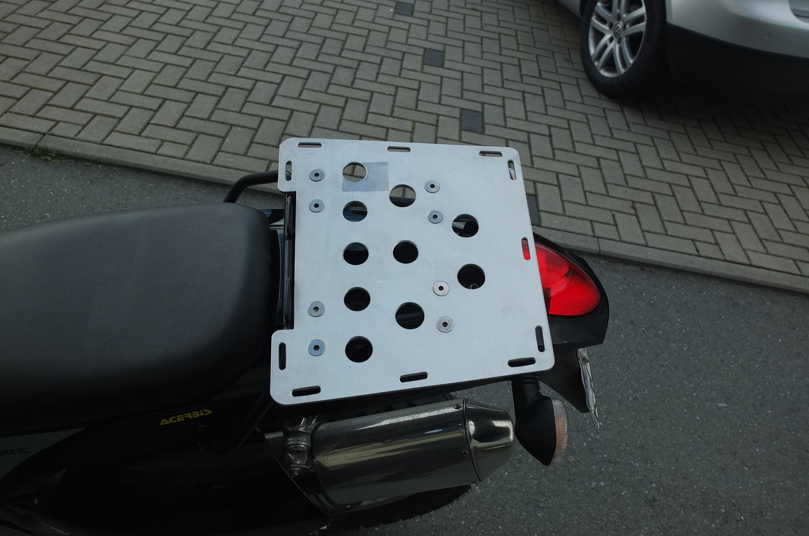 Wenn man Inbus-Senkkopfschrauben verwendet, kann man die Platte bequem von oben (vor dem Urlaub) auf die originale Gepäckbrücke schrauben oder eben danach entfernen.