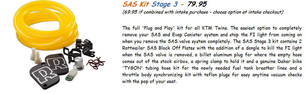 The full 'Plug and Play' kit for all KTM Twins. The easiest option to completely remove your SAS and Evap Canister system and stop the FI light from coming on when you remove the SAS valve system completely. The SAS Stage 3 kit contains 2 Rottweiler SAS Block Off Plates with the addition of a dongle to kill the FI light when the SAS valve is removed, a billet aluminum plug for where the empty hose comes out of the stock airbox, a spring clamp to hold it and a genuine Dakar bike 'TYGON' tubing hose kit for the newly needed fuel tank breather lines and a throttle body synchronizing kit with teflon plugs for easy anytime vacuum checks with the pop of your seat.