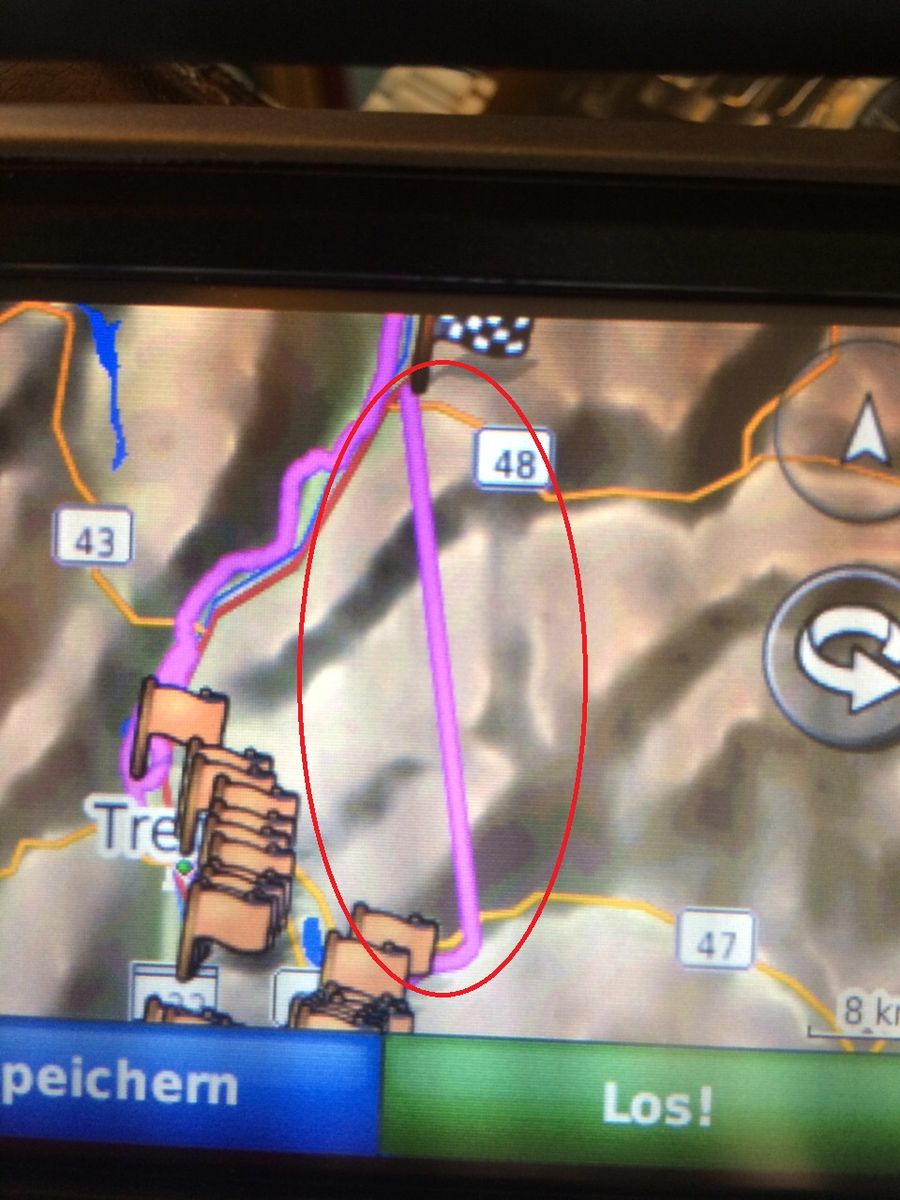 Wenn ich dann die Tour auf´s Zumo 660 spiele, ist meist ein Teil der Strecke einfach in Luftlinie dargestellt?!? Siehe Foto.