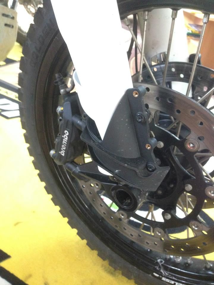 Sind von einer SX. Es gibt auf dem Markt nichts wo einfach so passt! Gabel raus, Schützer drüber, etwas zu- und ausgeschnitten, provisorisch mit Kabelbinder fixiert und mit dem original Kotflügeladapter dann befestigt.