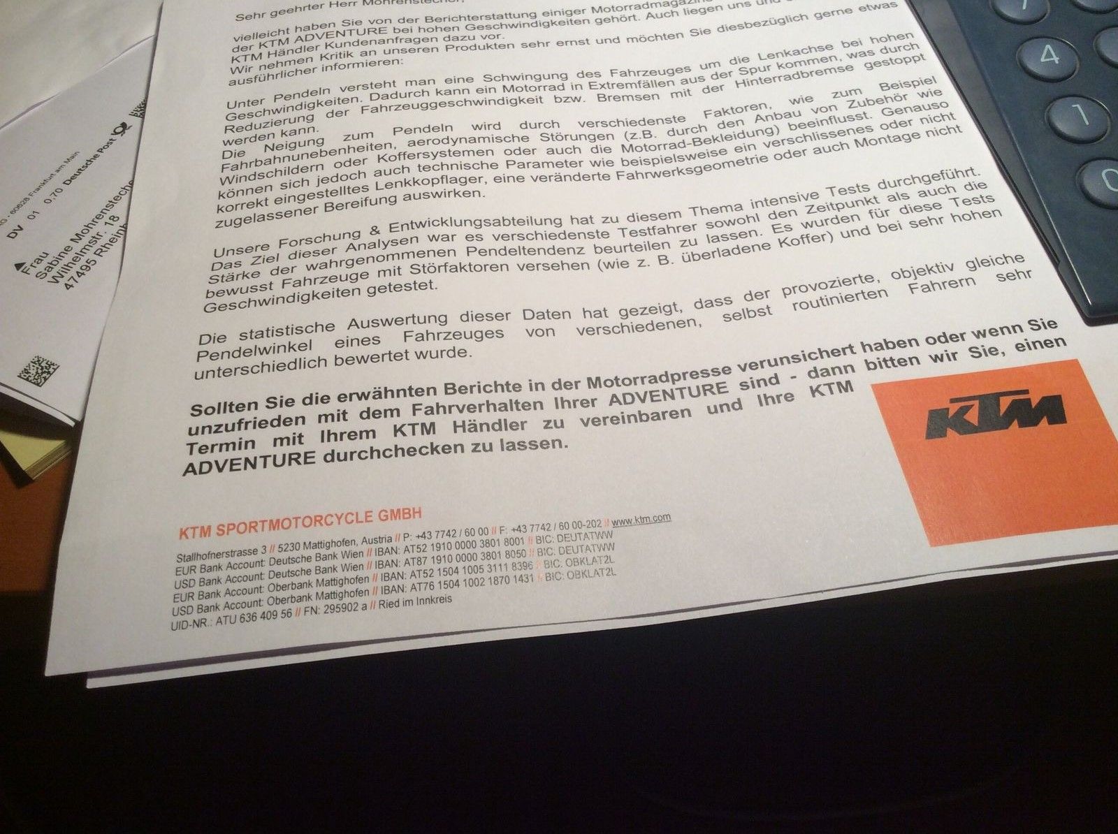 Haben alle 1190 Besitzer gestern Post von KTM bekommen und wurden zum kostenlosen Check von Moped nebst Fahrwerk etc. wegen V.a. Hochgeschwindigkeitspendeln eingeladen ?