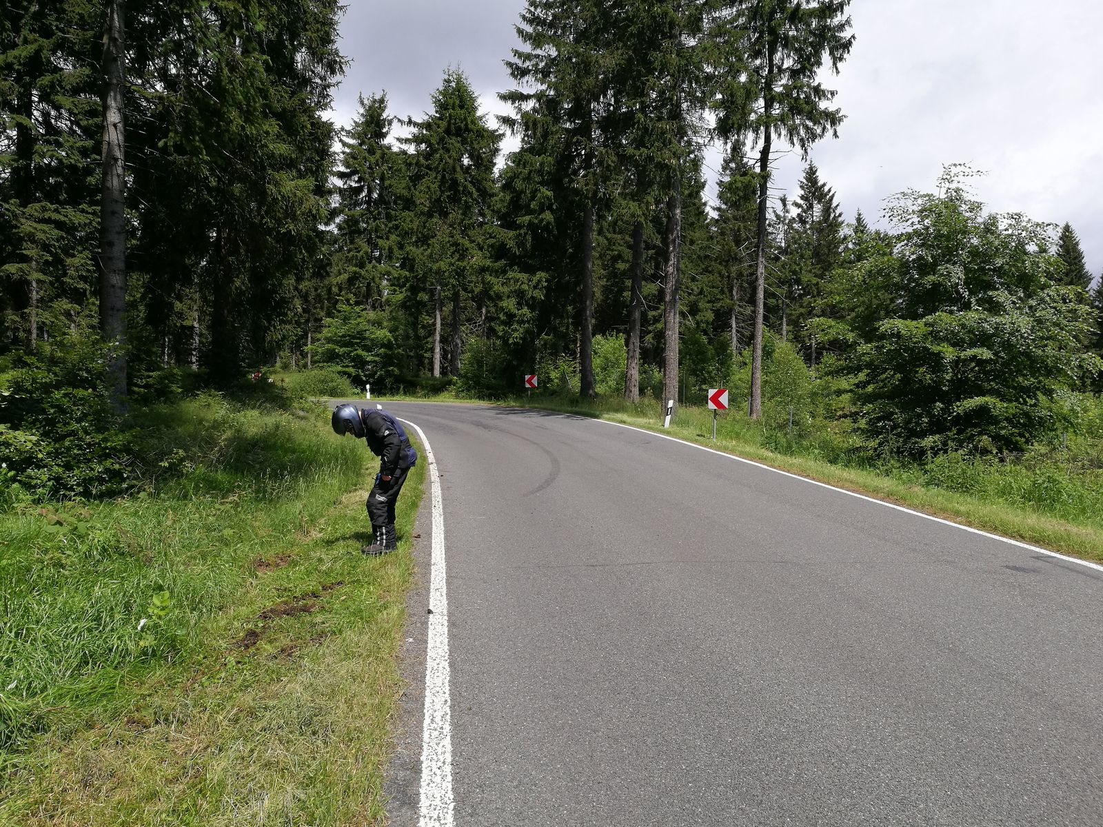 als das Moped dann schon Blickrichtung Wald hatte dann der klassische High Sider Abwurf