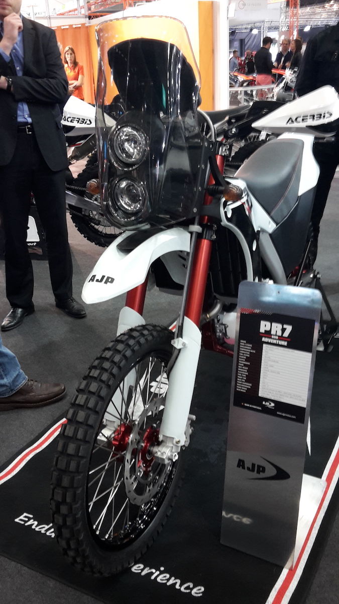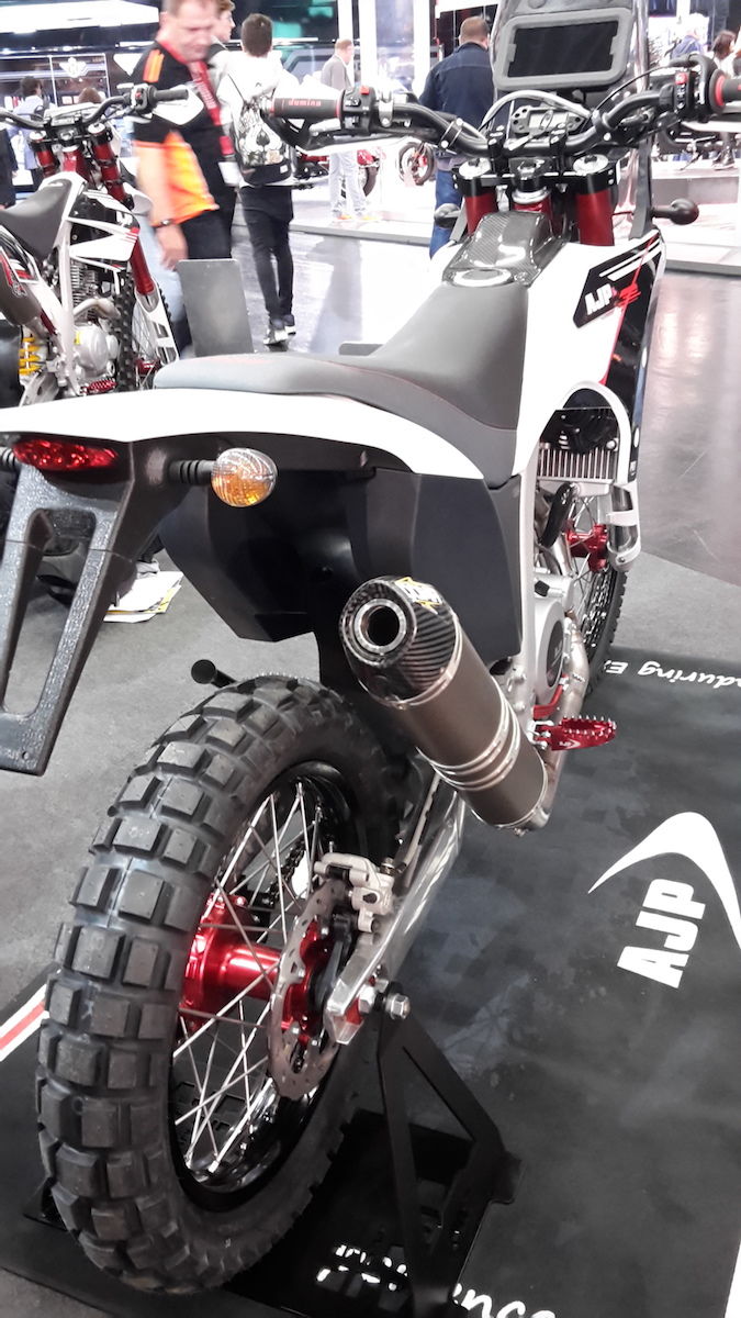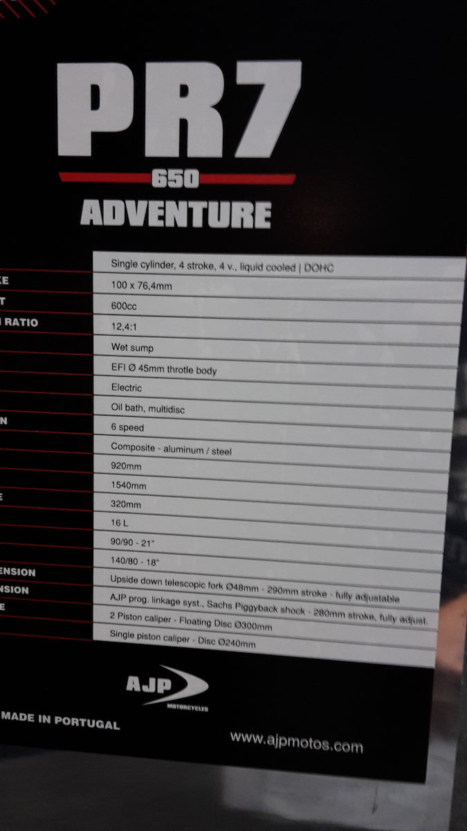Habe mich eine halbe stunde mit einem portugiesischen Inscheniör am AJP Stand unterhalten. Der Motor stammt von der SWM650 und also von der Husky 630. Der Tank umfasst 17L und ist unter dem Sitz. Es soll noch ein Alu Motorschutz sowie ein Gepäckträger kommen, der Heckrahmen ist aus Stahl und ist belastbar mit Gepäck. Es wird erst mal im Winter eine Kleinserie von 100stk produziert.