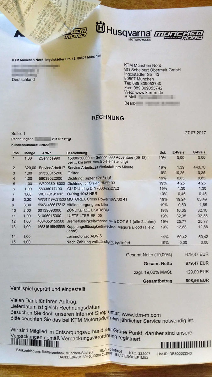 Seit ich aus der Garantiezeit raus bin, gehe ich hier im Bayernwald (bin nicht mehr im Münchner Raum) zu einer kleinen Werkstätte, die ich nach kurzen Suchen und Tipps aus der lokalen Biker-Szene gefunden hatte. Der Besitzer ist selber KTM-Besitzer und fährt auch Enduro-Rennen, der mir diese Arbeiten für einen Bruchteil der Gage macht, die Du bezahlt hast. Ich kann sogar das Öl meiner Wahl mitbringen (das Motorex scheue ich eh!) und auch andere Ersatzteile, die er einbaut ohne zu meckern, dass er dadurch finanzielle Einbußen hat. Mein Rat: such Dir eine kleine, gute Werksatt...frag mal die Münchner Biker wo sie hingehen.