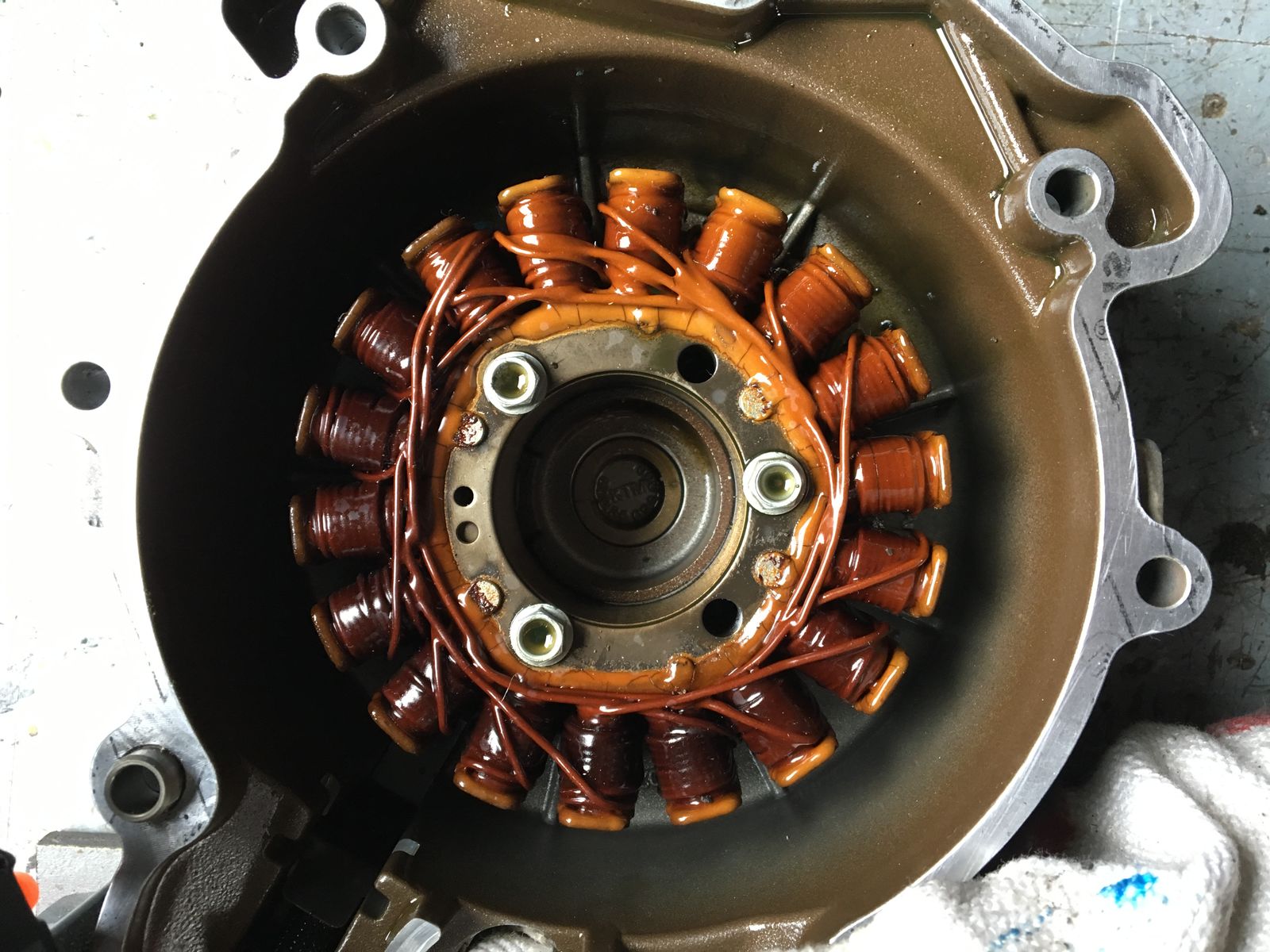 ...solange nichts schwarz ist! Neue Wicklungen sind insgesamt heller, aber Deine 950ADV hat schon einige Kilometer auf dem Buckel. Der Schutzlack um die Wicklungen des Stators verfärbt sich mit der Zeit, das ist soweit normal. Je wärmer sie werden, desto dunkler. Typischerweise liegen die dunkleren Wicklungen wie bei Dir im Bereich des Gehäuses nach vorne/oben. Weniger kühlendes Öl, dazu im Warmluftstrom zwischen Krümmer und Tank nach hinten. Bedenklich wären schwarz angekokelte Stellen, auch Risse im Lack der Wicklungen. Sicherheitshalber kannst Du am 3-poligen Stecker der LiMa mit einem Multimeter auf Widerstand prüfen. Einfach die Steckerpole der drei gelben Kabel gegeneinander prüfen - Sollwert ist maximal 1,0 Ohm bei 20°C. Deutliche Abweichungen würden auf einen sich anbahnenden Schaden hinweisen. Wenn die LiMa wieder montiert ist, kannst Du der Vollständigkeit halber an der offenen Steckverbindung noch alle drei Leitungen auf Masseschluß prüfen.
