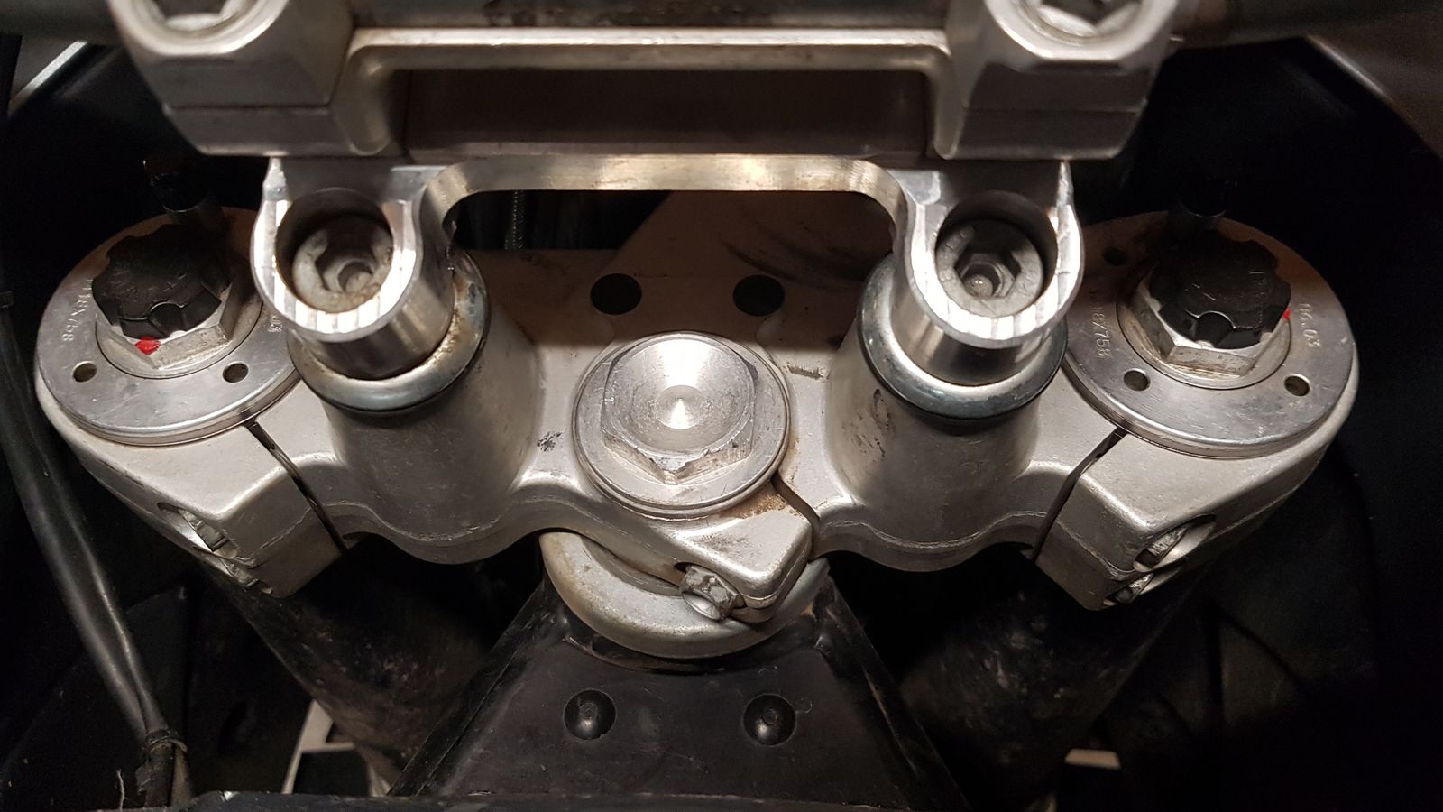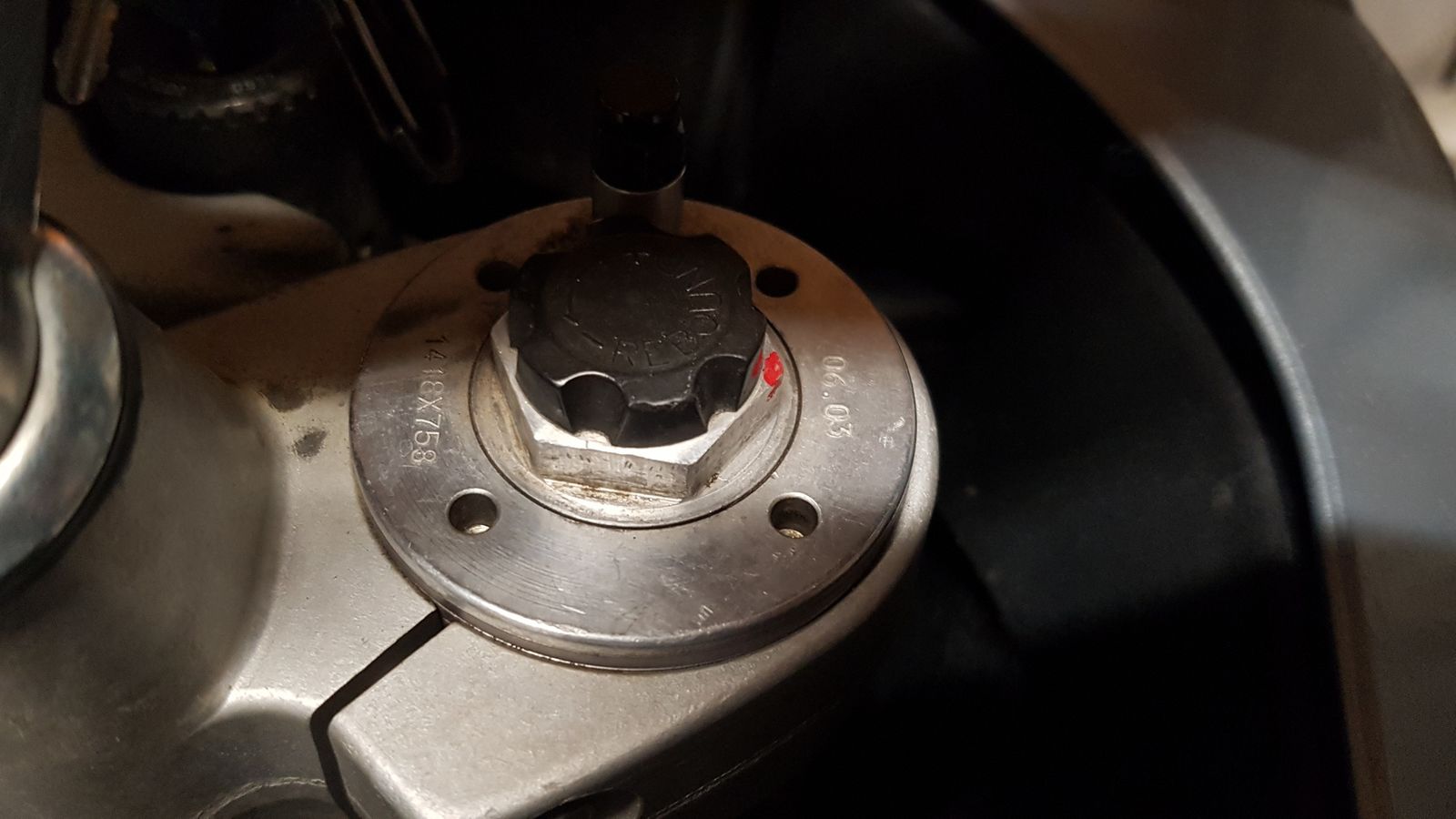 Dabei fiel mir auf, sich sich am rechten Gabelholm die Federvorspannung selbststäding um 90 Grad verdreht hat. (hatte mir mal als Einstellhilfe 2 Lackpunkte gesetzt)