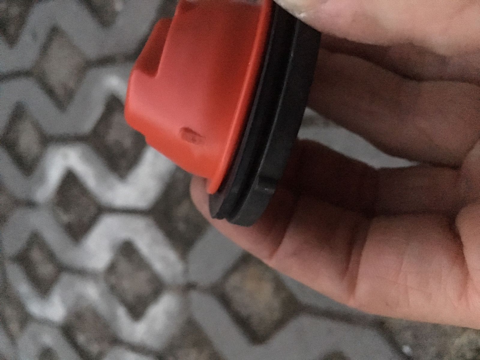 - Wenn ich einen Schlauch am Belüftungsnöppel der Deckelinnenseite ansetze und reinblase, um die Tankbelüftung zu simulieren, dann strömt fast ungehindert Luft aus allen vier Bohrungen der roten Abdeckkappe aus.