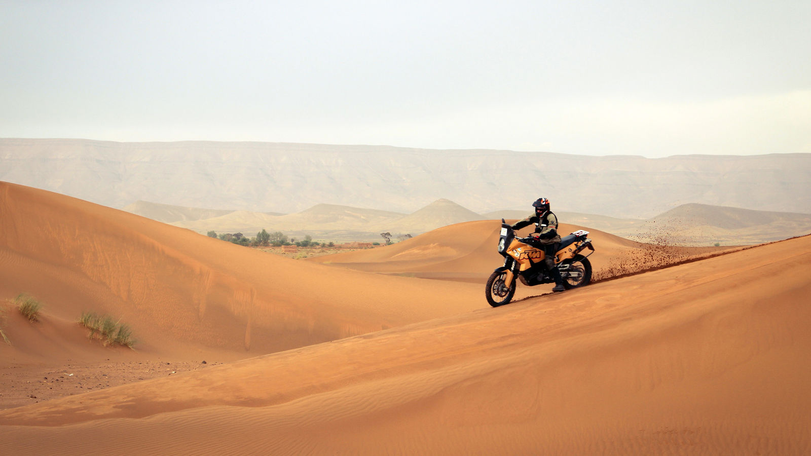 Am Morgen besuchen wir eine Schrauberwerkstatt in Zagora um für ein paar Dirham einen Sprüher Kettenfett zu erhalten. Hier steht eine Husky mit deutschem KnZ im Rallyetrim, Hecktank musste geschweißt werden. Die Werkstatt kommt mir bekannt vor, sicher aus dem Forum. Ich ziehe die LC4 auf den Seitenständer, der Bursche, der mir am Vortag eine komplette Dose für 600DH verkaufen wollte sprüht auf die Kette – die Dose ist kaputt es hört nicht mehr auf. Er hält die Hand drüber – zwecklos. Beim zweiten Anlauf, er sprüht - plötzlich KNACK – Seitenständer an der Aufnahme angebrochen. Fluchend baue ich ihn ab. Während des schweißen richtige ich noch eins, zwei Folgen eines Umfallers bevor wir in die vom Regen getränkte Wüstengegend aufbrechen. Ab jetzt bringt uns jeder km näher Richtung Heimat. Die Weite der Landschaft ist unglaublich. Piste lässt sich kaum fahren, zu viel Nässe und die Gefahr im Lehm stecken zu bleiben. Ich bin nicht gläubig aber für mein Fluchen will ich eine gute Tat tun und nehme ein Berber ca. 15km mit. Der arme Kerl, ohne Helm, Schlappen hat er nicht verloren. Die Flüsse sind angeschwollen. Wir haben viele Flussquerungen, auch welche bei denen ich vorher teste und mit nassen Füßen zurückkehre. Mehrmals bin ich Vortester für wartende Autos am Fluss. Alles geht gut.