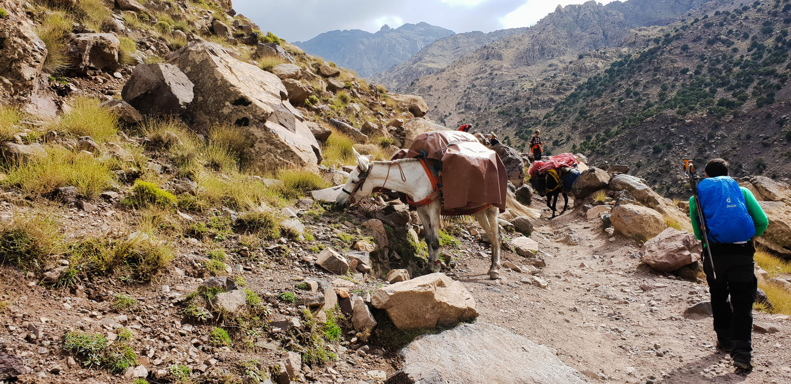 Wir verlassen Marrakech, überrascht - sogar auf unseren eigenen Bikes. Marrakech: auch meine Frau wollte in die Souks von Marrakech. Wir buchten ein Riad direkt in der Medina. Ja und wir sind auch mit den Bikes dort hin gefahren. Farben, Gerüche, Lärm, Gestank, Händler, Verkehrschaos, Einheimische, Hipster Touris, Faux Guides: alles gemischt mit dem arabischen Charme. Das erlebte würde den Bericht sprengen. All das lassen wir hinter uns. Ziel ist das „Bergsteigerdorf“ Imlil auf 1600m. Wir erreichen das Dorf, Argan- und Walnussbäume säumen die kleine kaputte Straße. Von hier wollen wir zur 3200m hoch gelegenen Hütte Refuge du Toubkal les Mouflons wandern um am nächsten Tag den 4167m hohen Djebel Toubkal zu besteigen. Maschinen und Gepäck geben wir in die Obhut eines alten Parkplatzwächters der mit seinem Leben aufpassen will.