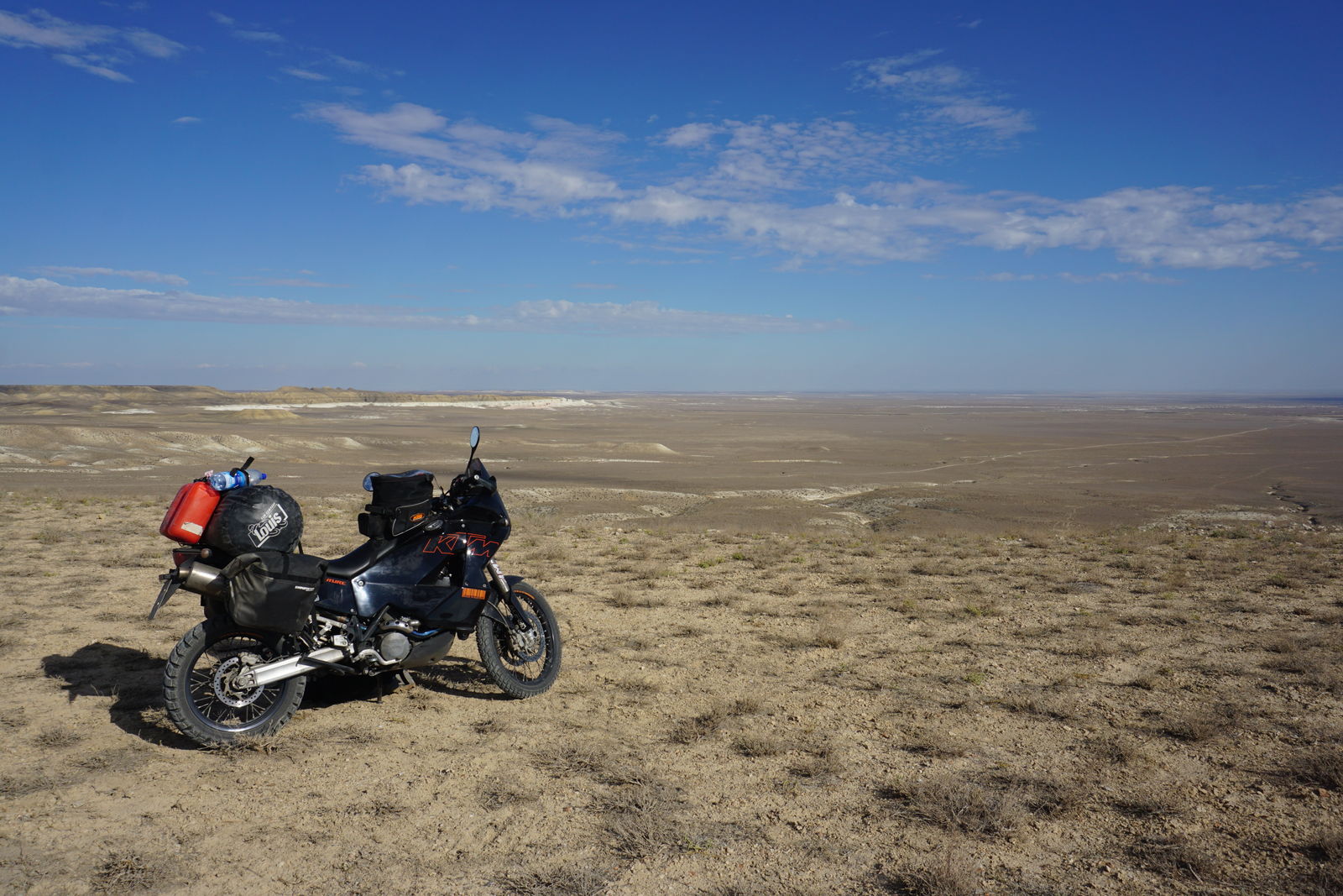 In Aqtau hab ich dann für zwei Nächte Pause gemacht, war baden (Kaspisches Meer is verflucht kalt) und wollte der Kati einen Ölwechsel spendieren. Die örtliche KTM-Werkstatt hat leider vor wenigen Monaten dicht gemacht, daher fiel das dann aus. Als nächste Etappe war dann der Weg an der Küste entlang zur turkmenischen Grenze geplant. Zuerst ging es nach Schangaösen mitten in der Wüste zum Auftanken und Wasser kaufen. Achtung, die dortigen Tankstellen akzeptieren nur Bargeld (im Gegensatz zum Rest des Landes..)! Die folgende Strecke durch das kasaschische Nirgendwo gestaltet sich in etwa wie folgt: 100km Strecke die in ordentlichem Zustand sind und 50km völlig zerbröselte Piste/Waschbretthorror! Links und rechts der ehemaligen Straße hatten die Kasachen dutzende Ausweichpisten in die Wüste gefahren und auf denen sollte man auch fahren wenn einem das Motorrad lieb ist. In einem der dortigen Sandfelder hatte die Kati dann aber leider auch den ersten Bodenkontakt seitdem sie in meinem Besitz ist. Außer Kratzern nix passiert, aber das Ego hat erheblich gelitten... An der Grenze angekommen (Zwei große sich gegenüberliegende Häuserblöcke mitten im Nirgendwo) war verdächtig wenig los. Mir wurde dann auch schnell mitgeteilt, dass die Grenze seit über 3 Monaten auf turkmenischer Seite für Touristen geschlossen war. Es wurde nur noch Frachtverkehr durchgewunken.