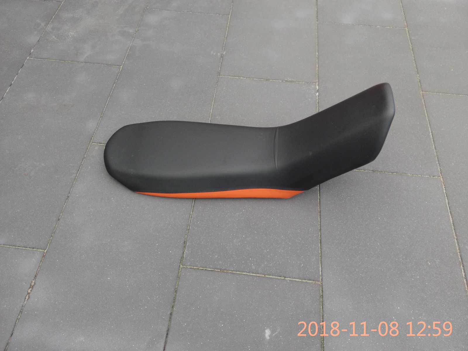die angebliche 990ADV-S aus 2009 ist tatsächlich eine 990ADV-R, wie sie von 2009 bis 2012 gebaut wurde. Diese gerade Sitzbank in schwarz-orange ist die Seriensitzbank der "R" mit der Teilenummer 6000704000004B. Die paßt problemlos auch auf Deine ´08er Adventure. Im Grunde ist das immer noch dieselbe Form wie seit der 950ADV-S aus 2003, also etwas nach vorne abfallend und schmal. Ideal für sportlicheres Fahren, nicht ideal für die Sozia. Der verwendete Schaum ist härter als derjenige der Stufensitzbank.
