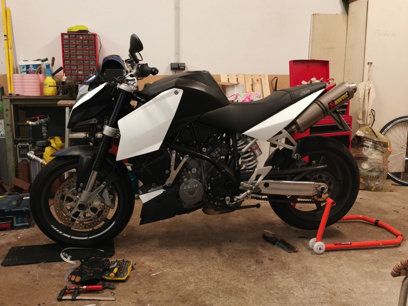 letztes Jahr habe ich mir eine Superduke 990 aus dem Jahr 2005 zugelegt. Ich bin sehr zufrieden und das Bike macht unglaublich viel Spaß. Das einzige was mir nicht gefällt ist die Front. Wenn ich im Netz suche finde ich einige Umbauten wobei mir der Umbau auf dieDuke 3 Maske am besten gefällt. Leider finde ich keine detaillierte Umbauanleitung sondern nur ein paar sehr unscharfe Bilder. Hat vielleicht jemand hier im Forum so einen Umbau schon vorgenommen der mir eventuell ein paar Tipps zu den Halterungen und der Kabelunterbringung geben kann.