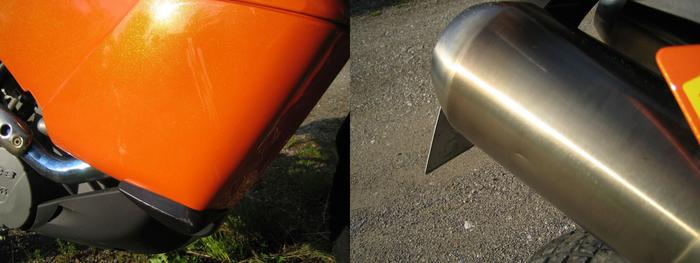 Leider hat Sie mal einen Kratzer am Auspuff und am Tank abbekommen als sie mir vom Seitenständer umgkippt ist. (siehe auch Bilder)