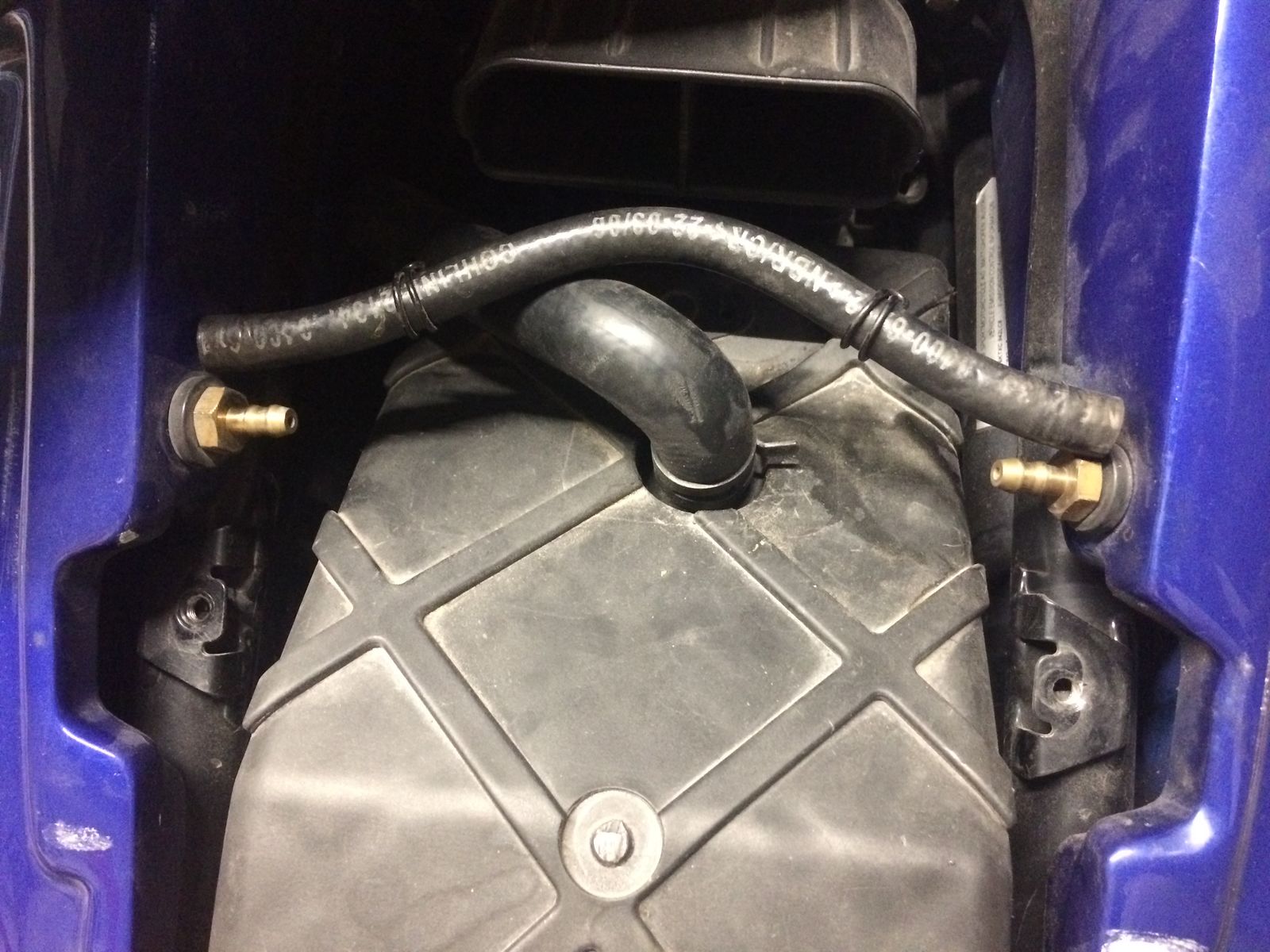 Wenn man sich vergewissert, daß die serienmäßige Tankbelüftung über die beiden Hamsterbacken funktioniert, kann man die obere Querverbindung ohne Weiteres entfernen und die beiden Bohrungen verschließen. Der Wegfall dieses Schlauchs würde auch die Wartung erleichtern.