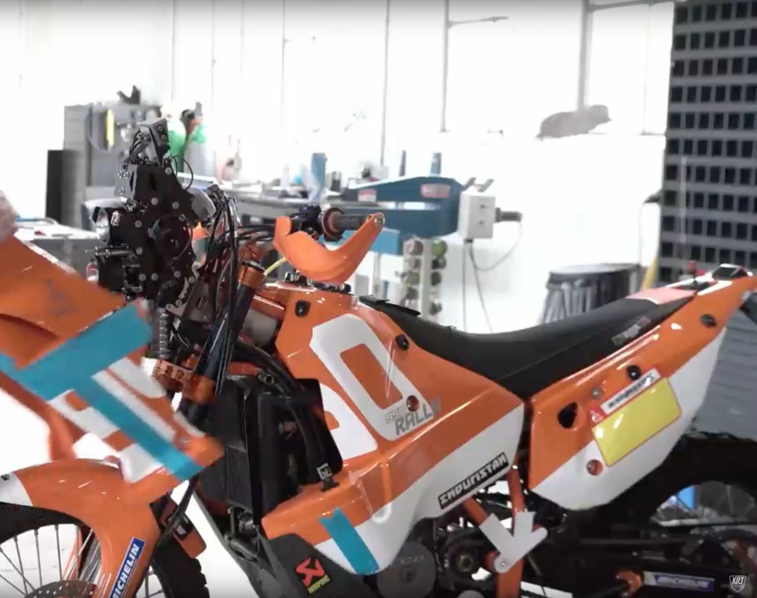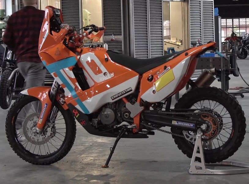 Die Maschine ist eine SE als Basis. Kühler und Ausgleichbehälter sieht man ganz gut. Auch die Schwinge hat die solide Kettenführung der SE. Die Gabelbrücke könnte eine PP der 450 Rallye sein. Damit ist zumindest schon die Aufnahme für einen Lenkungsdämpfer gegeben. Bei der Gabel wird es sich dann auch um eine der SE mit 250mm Federweg handeln. Die Räder sind auch die DID Dirtstar
