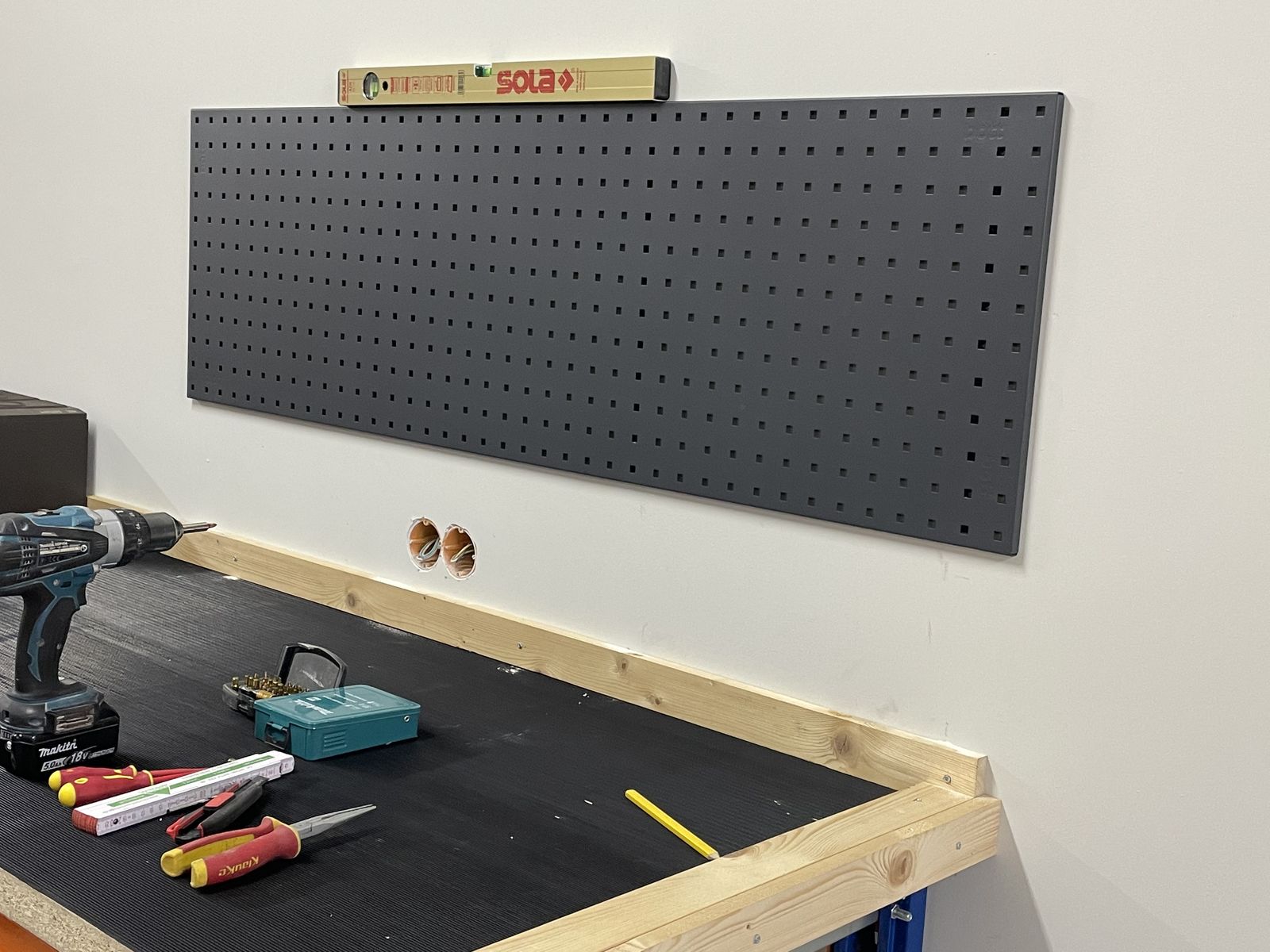 Habe heut mal Lust verspürt, die zweite Werkbank zu komplettieren und die beiden Lochplatten mit Schneckendübeln an der GK-Wand zu befestigen.