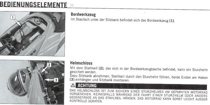 Wenn das tatsächlich das Kabel für das Helmschloss ist, habe ich auch jetzt den dazugehörigen Haken gefunden - links unten an der Airbox. Exclamation