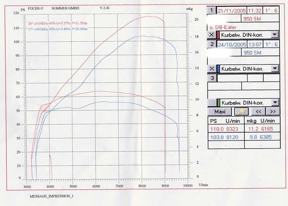 Zwei Wochen später war dann die 1.000er Durchsicht. Da wurde dann vom Team Sommer alles gemacht was bis zum damaligen Zeitpunkt machbar war- also Luftfilterdeckel, Sportbedüsung, EPC-Stopfen und Feinabstimmung- Resultat waren dann 104 PS mit etwa 98 Nm.