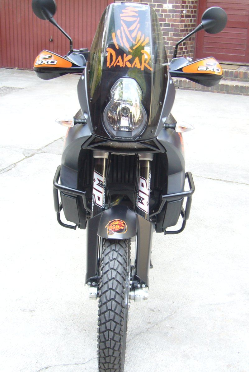 In halborange mochte ich die 990er nicht. Für die Blaue bin ich zu kurz und die mattschwarze Version war mir zu langweilig. Deshalb die Aufkleber und meine alten Sitzbank in orange. Die meisten Aufkleber sind von Motobau. Die Dakar-Symbole sind von der Stickermafia. Aber Aussehen ist ja sowieso Geschmackssache...