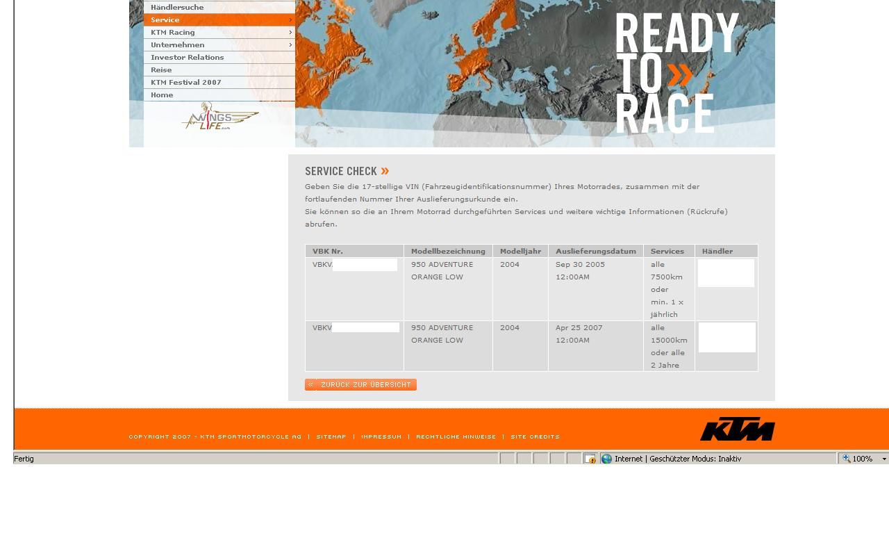 | Mattisk @ Mi, 25. Apr 2007, 20:29 hat folgendes geschrieben: | | Zusätzlich kann man sich auch mit der ID von der Auslieferungsurkunde und FgstNr unter KTM anschauen was an Inspektionen gelaufen ist bzw. an Update´s offen ist. |