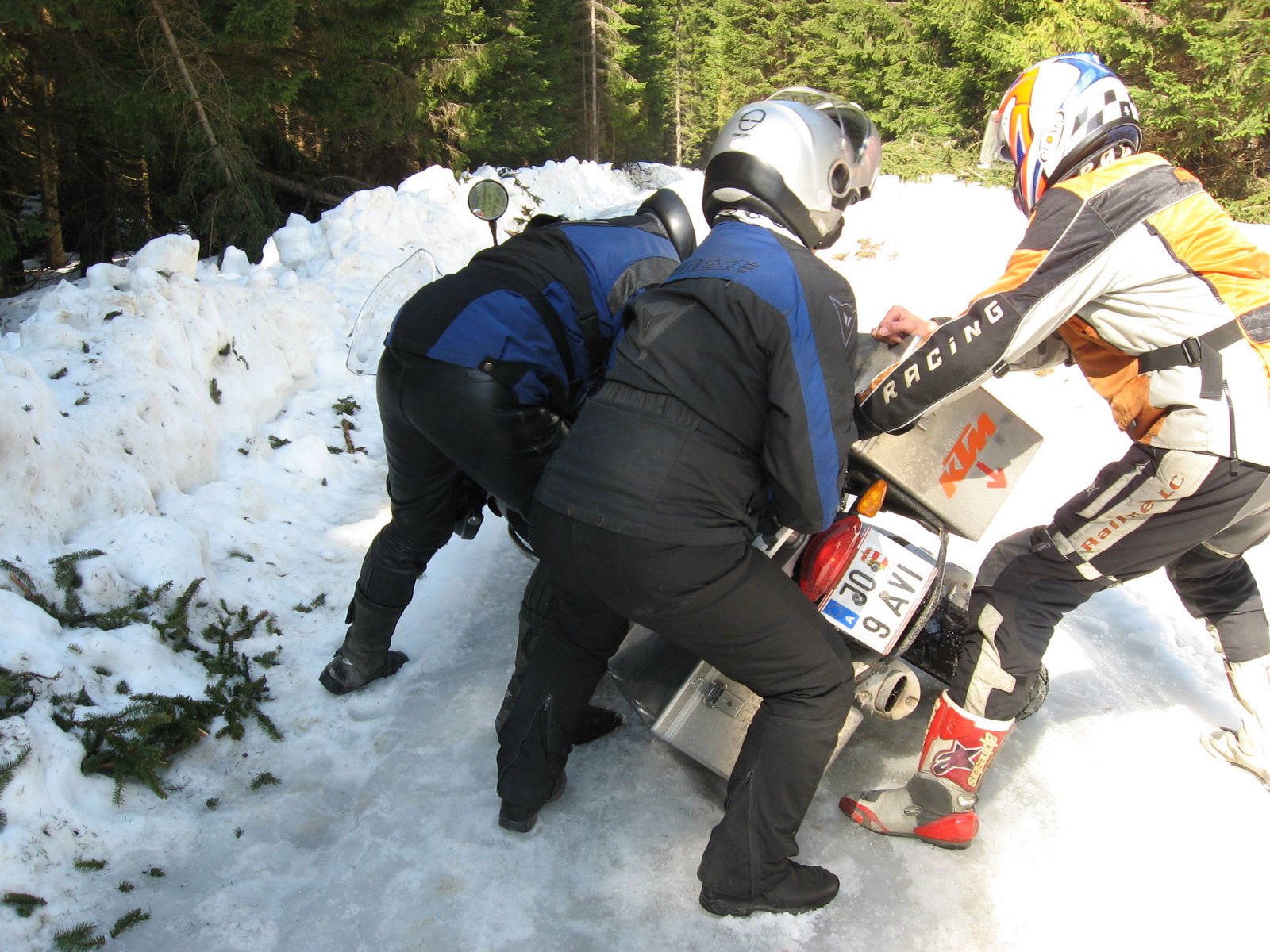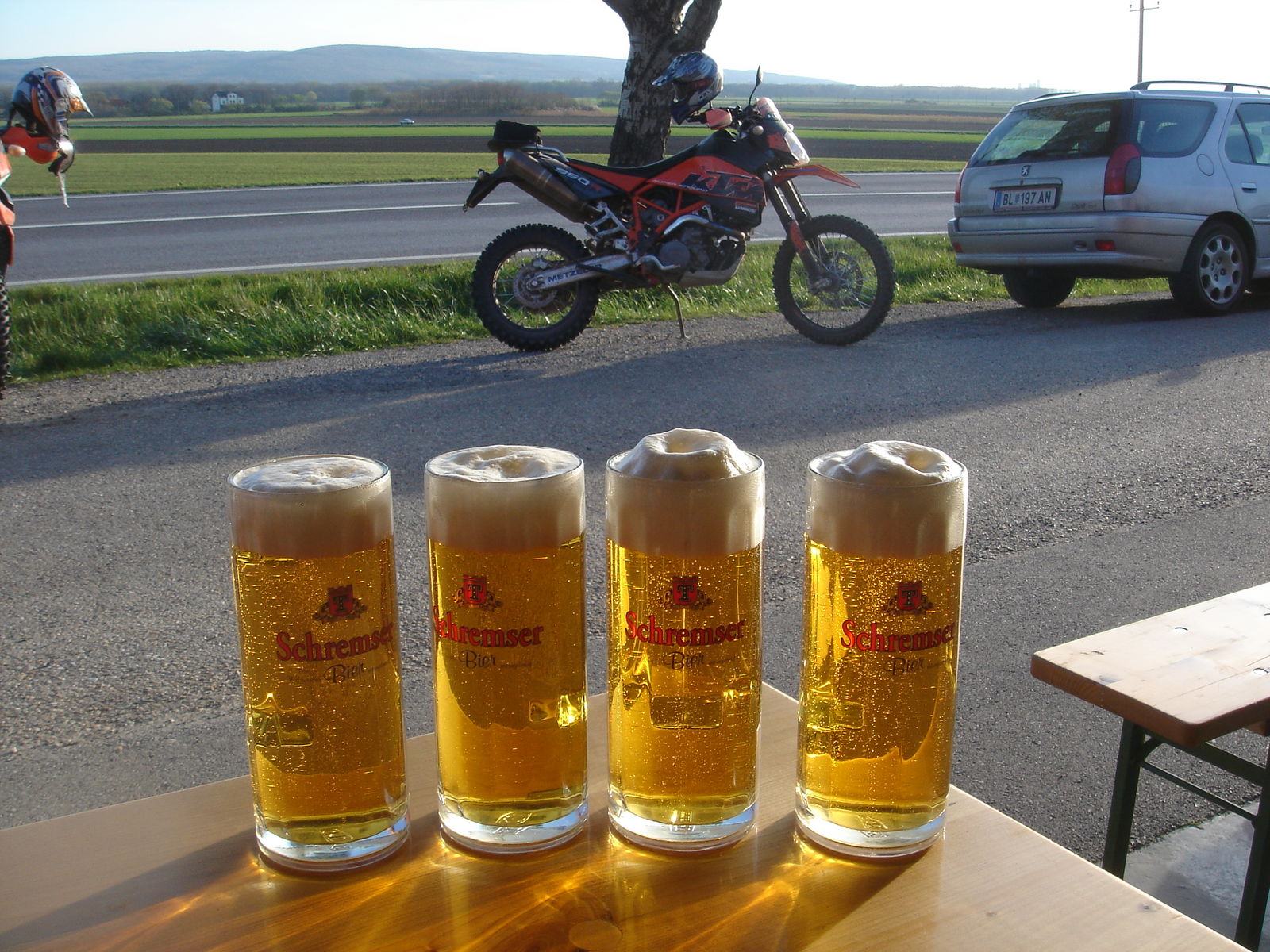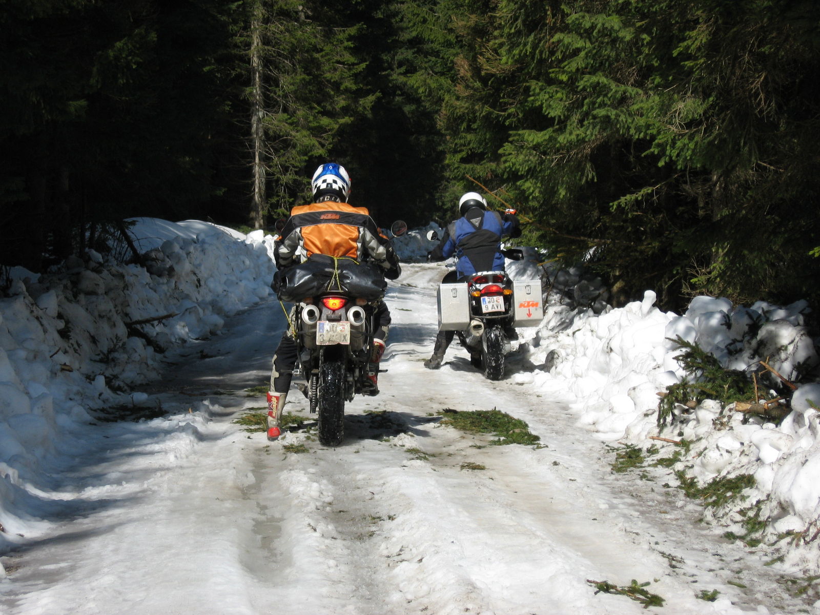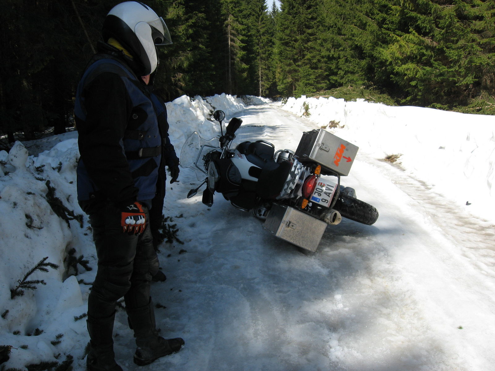 Aber interessant ist, dass man sogar in Karlobag noch den Schnee vom Meer aus sieht und in Slowenien in der Nähe von Zali Log habn wir überhaupt Eis-unter-Schneefahrbahn gehabt (also richtig enduriern geht noch net wirklich, die haben noch fast mehr Schnee als wir), da hätten wir fast einen Bergepanzer für den Eisenhaufen braucht