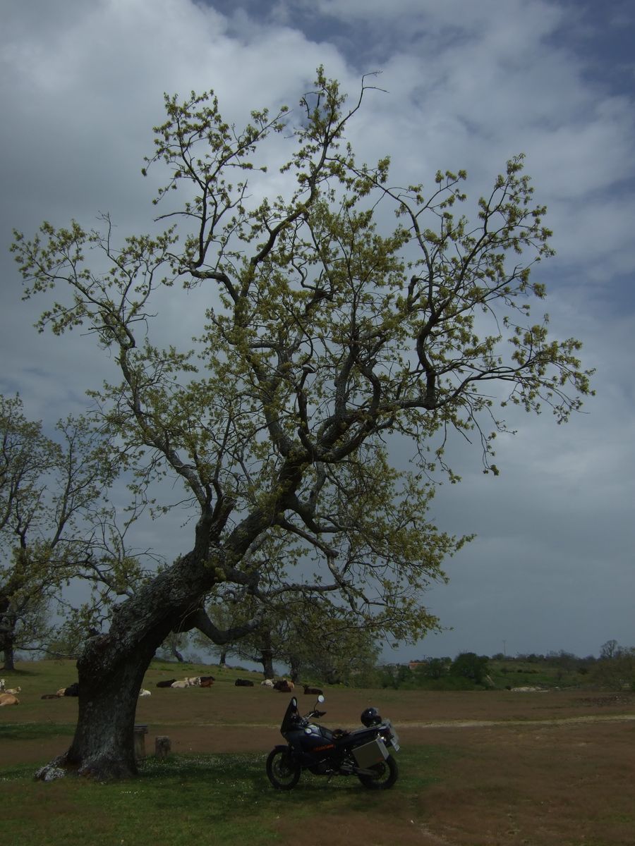 Da ich lernen musste und mich eh etwas wackelig fuehlte, bin ich nicht sehr viel umhergefahren, sondern habe mir ein paar schoene Stellen gesucht. An einem einsamen Rastplatz in der Natur blieb ich 6h, umgeben von spanischen Eichen, einer grossen Kuhherde (Bullen, Kuehe und Kaelber bunt gemischt), Schafen und Ziegen habe ich mir mein Lernstudio eingerichtet und den Tag genossen.