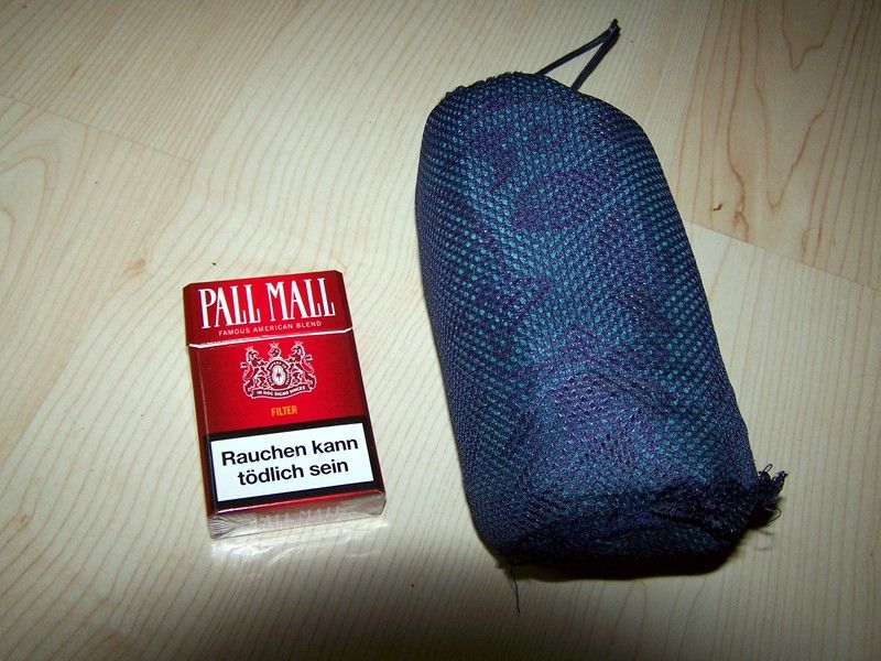 Er ist super klein, etwas kleiner, als eine Camping-Gaz-Kartusche C206. Hab mir wegen des Geruchs aus einem alten Packsack eine dichte Hülle genäht.
