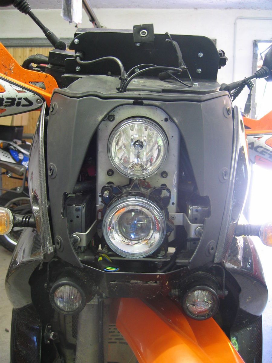 Also ich habe bei meinem Mopel auch den oberen Scheinwerfer (KTM-Bastler-Umbau) gegen einen Xenon-Fernlichtscheinwerfer von Hella getauscht. Angeschlossen am serienmäßigen Fernlichtanschluss und funktioniert einwandfrei.