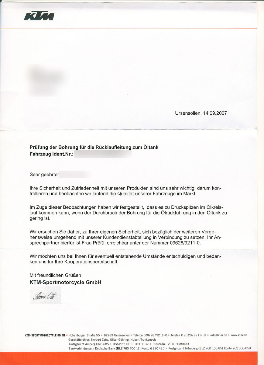 ich habe gestern ein Einschreiben von KTM bekommen - Zu meiner eigenen Sicherheit möge ich mich mit der Kundendienstabteilung in Verbindung setzen. Thema: Prüfung der Bohrung für die Rücklaufleitung zum Öltank