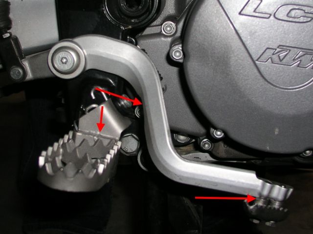 ich habe seit letztem Jahr die Motobau Fußrasten für die Adventure/LC4 montiert. Das Ganze kommt dann 3 cm tiefer. Hier mußte dann aber der Fußbremshebel etwas bearbeitet werden, damit er tief genug kam. Dabei wurde die Stange zum Bremszylinder etwas gekürzt. Dabei ist zu beachten, daß bei extremer Kürzung der Bremshebel etwas ausgefräst werden muß, damit er nicht mit der Fußraste in Konflikt kommt. Zusätzlich habe ich noch die Raste am Bremshebel nach unten gesetzt (ca. 1,5 cm). Die Methode ist einfach: 2 längere Edelstahlschrauben aus dem Baumarkt mit einer Packung Unterlegscheiben von unten einschrauben. Das Ganze gut mit Schraubenkleber sichern und fertig ist die Laube Mr. Green .