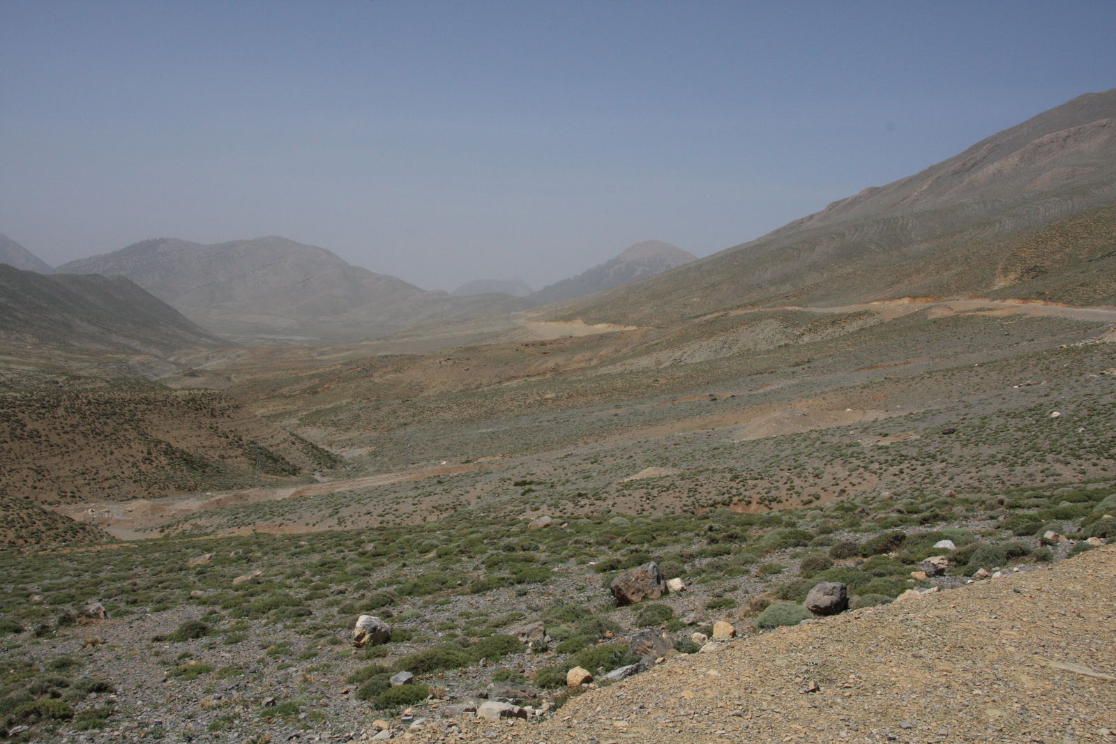 | Fruchtbares Tal, trockene Höhen und unten eine kleine Straße, mal mit, mal ohne Asphalt. |
