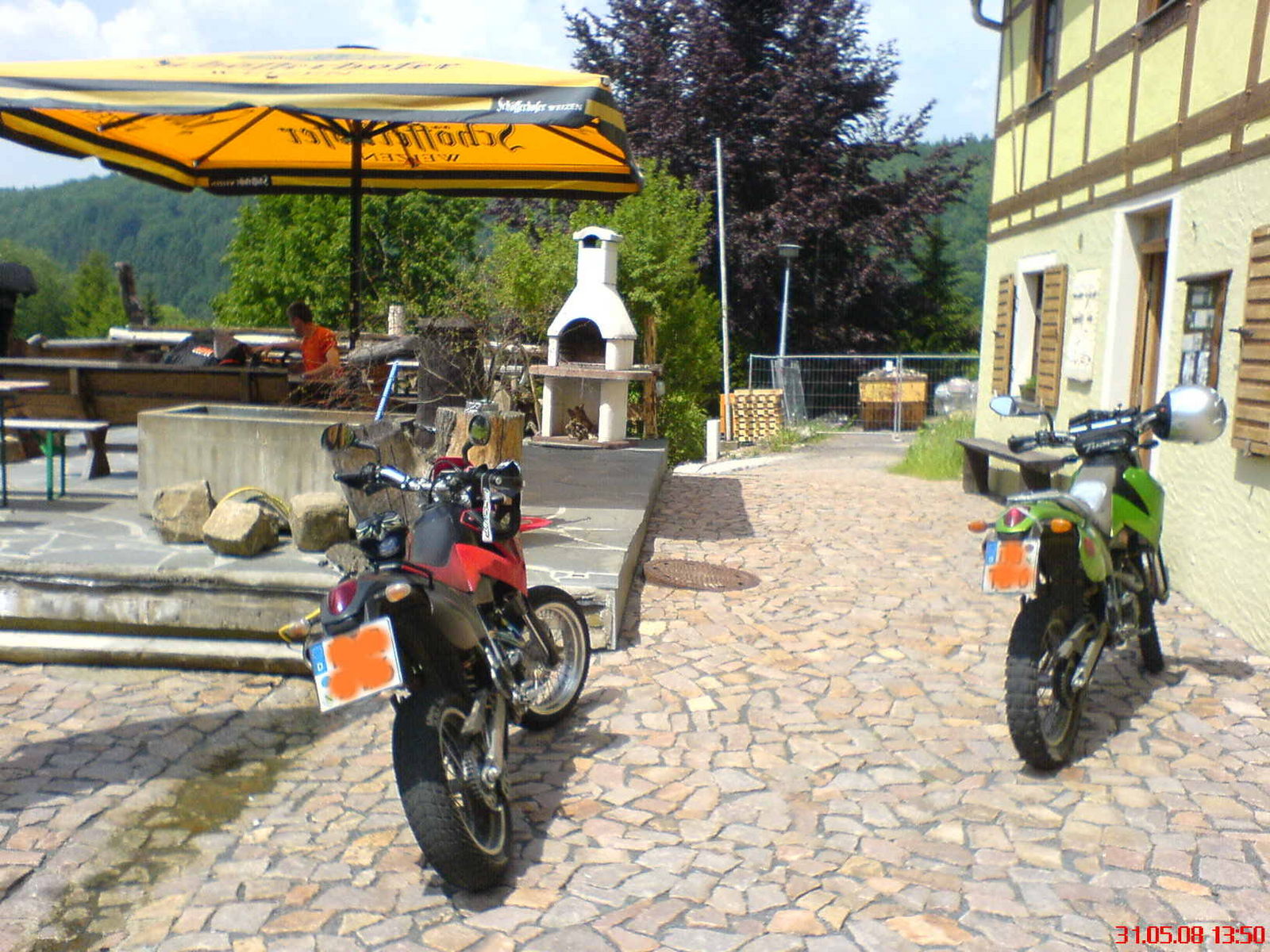 Weiter über Hrensko-Bad Schandau-Hohnstein-Pirna und wieder zum Bikertreffen mit Band und Steaks vom Grill und selbstgebackenen Kuchen. Zuhause im Trockenen gegen 21 Uhr angekommen traute ich meinen Augen nicht: Da wo ich immer mein Motorrad abstelle, lagen etwa 30 cm Hagel und alles war mit heruntergerissenen Blättern bedeckt, sowas hab ich noch nicht gesehen.