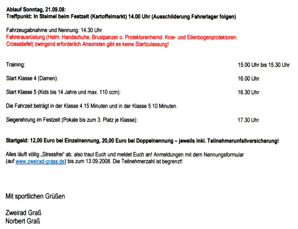 Wenn Ihr Euch ein schönes WE machen wollt (egal ob nur gucken oder auch selber mitfahren), dann kommt vorbei. Am Besten am 20.09. schon. Wir bekommen auch bestimmt ein kleines Rahmenprogramm aufgestellt mir ein paar netten Ausfahrten um Steimel und durch den Westerwald drum herum.