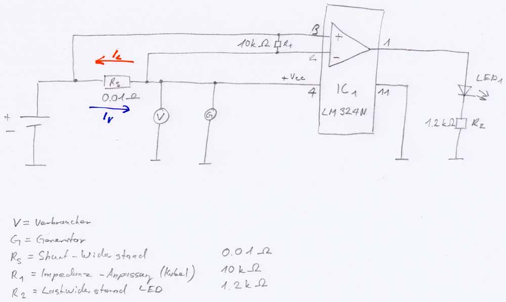 Im Anhang die Skizze der Schaltung, sie ist so ausgelegt, dass das LED immer leuchtet, es sei denn der Akku wird mit mehr als einem Ampère aufgeladen, dann ist es dunkel...