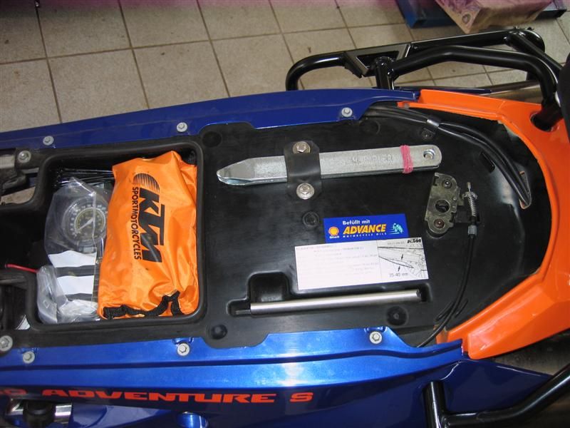 Nur als Denkanstoß: Ich hab zwei (Riesen)-Montierhebel (40 cm) in den Spalt zwischen Luftfilterkasten und linker Tankhälfte geschoben. Wenn man die noch ein wenig einwickelt, klappert auch nix....