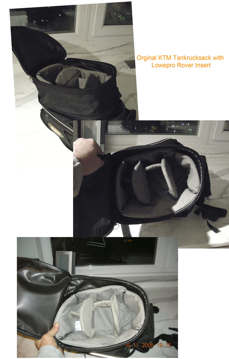 es gibt von TAMRAC einen kleinen Fotorucksack der haargenau in den Touratech Tankrucksack der LC8 paßt. Da habe ich meine Fotoausrüstung ( Nikon D200, 16-85mm , 2,8 70-200mm , drin. das Praktische ist, dass man mit einem Griff den Fotorucksack aus dem Tankrucksack rausnehmen kann,