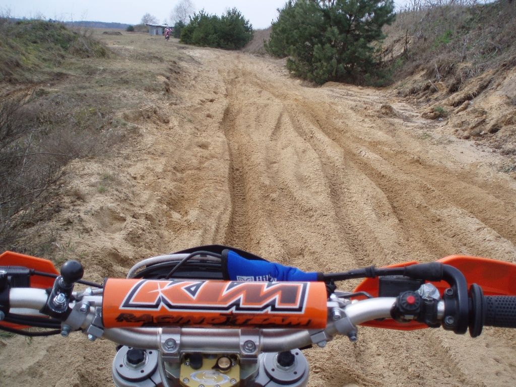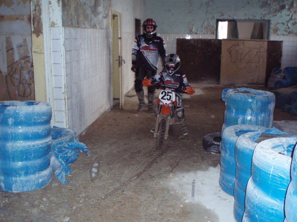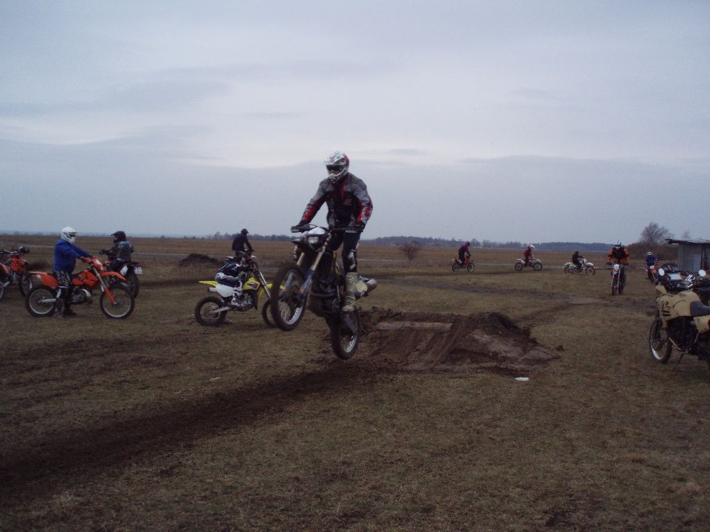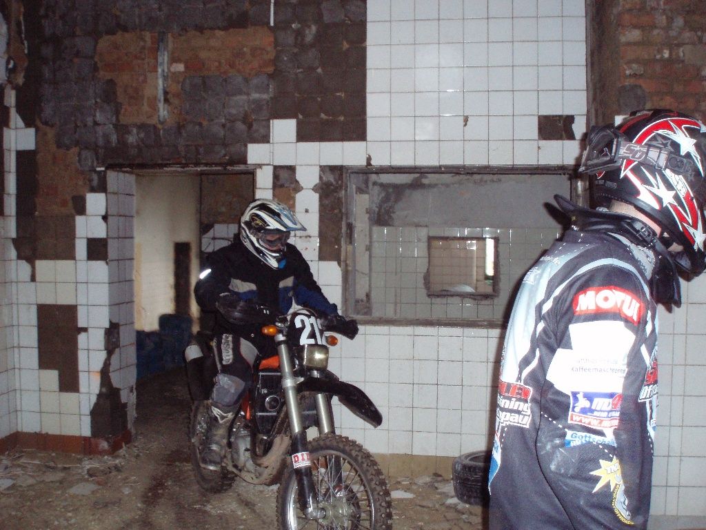 Rund um einen alten Militärflugplatz haben viele Helfer über Winter ein riesiges Enduroareal geschaffen. Einige von Euch werden es ja bei Ollos Grimmetreffen kennen lernen. Es lohnt sich! Da gibt es Tiefsand, Sprunghügel, Singletrails im Wald, Schlamm, Schotter ... am genialsten ist die Durchfahrt durch ein baufälliges Haus. In Jüterbog gibt es alles, was man sich als Endurofahrer freiwillig antun kann. Wir haben schon eine sehr seltsame Art, unsere Wochenenden zu verbringen.