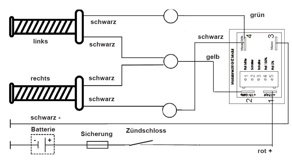 | Die beiden dünnen Kabel (bl + rt) sind für die Kontrolldiode. Die kannste auch weglassen, wenn zu kompliziert für Dich. |