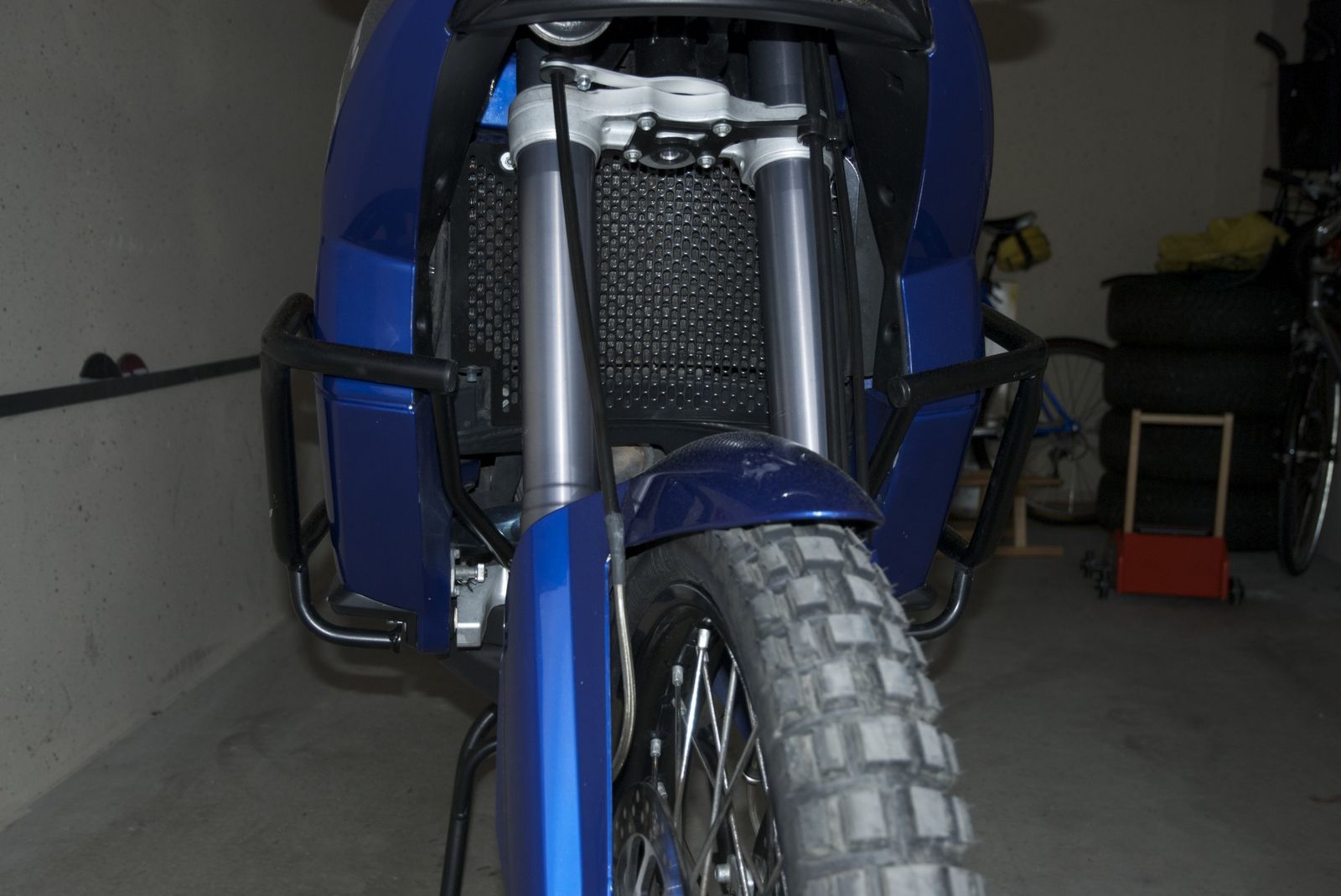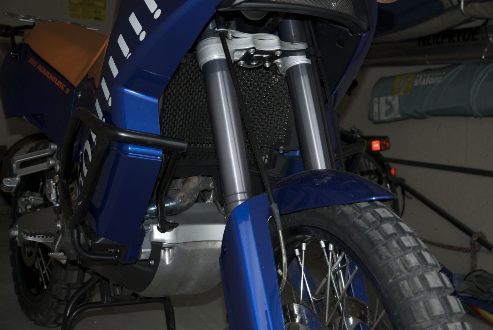 Befestigen ohne den Koti zu "beschädigen" wird wohl nix aber so würde ich keinen Meter fahren. Die Bremsleitung muß ja beim einfedern zwangsläufig die Bremsscheibe berühren ohmy
