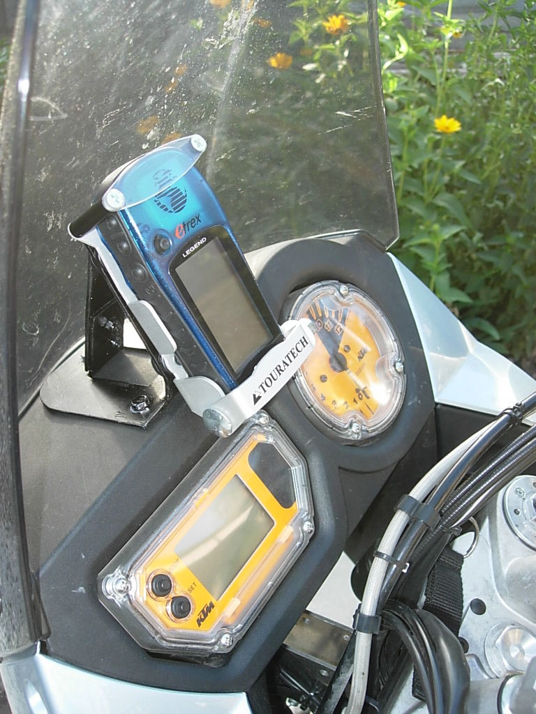 Für mein altes GPS III+ habe ich aus einem Stück Alublech und zwei dicken Dichtungsgummis selbst ´ne Halterung für die Lenkerstrebe(höhenverstellber, je nach dem, ob mit oder ohne Tankrucksack unterwegs!) gebaut. Kein Diebstahlschutz, funzte aber prima.