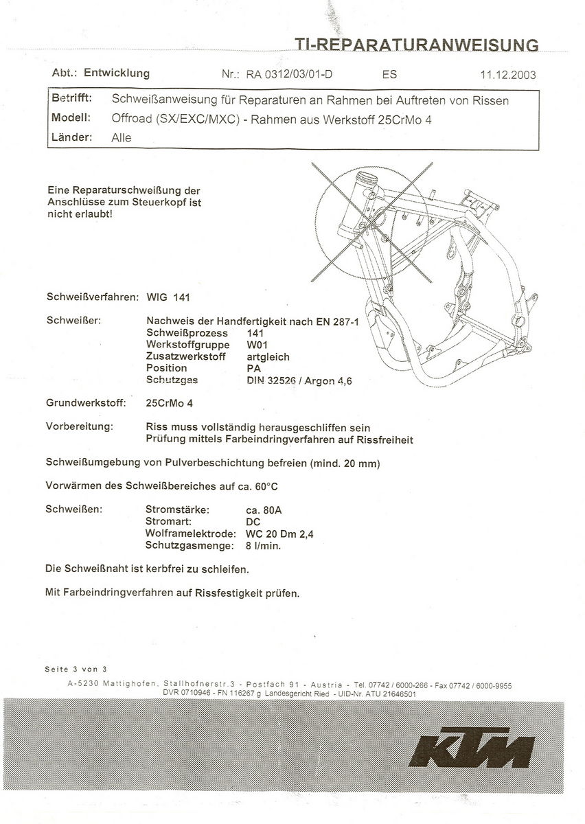 Wer soll später mal erkennen ob der Rahmen geschweißt wurde. Das kann man bei einem Kauf/Verkauf nur vom KTM-Händler erfahren. Ziemlich unwarscheinlich dass jemand sich die Mühe macht. Ich würde den einfach schweißen lassen.