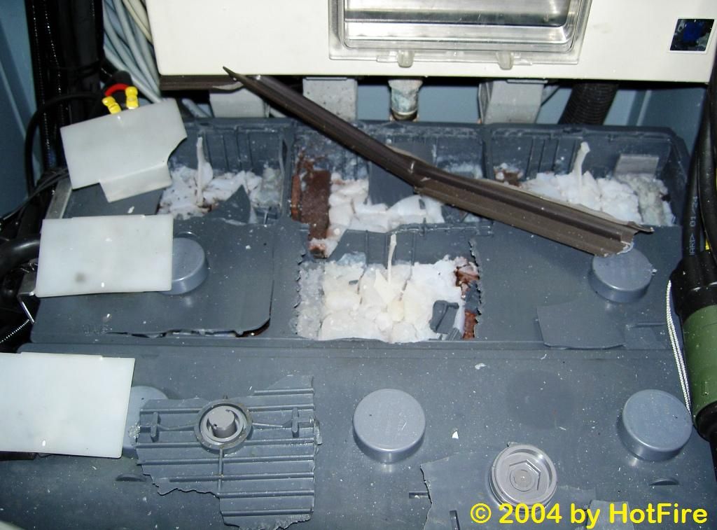 An dieser explodierten hinteren Geelbatterie war nur der aufgeklebte Temperatursensor runter gefallen und das Geelakkuladegerät "dachte" die Batterie hat nur 18°C und wird wohl ehr so 40°C gehabt haben: