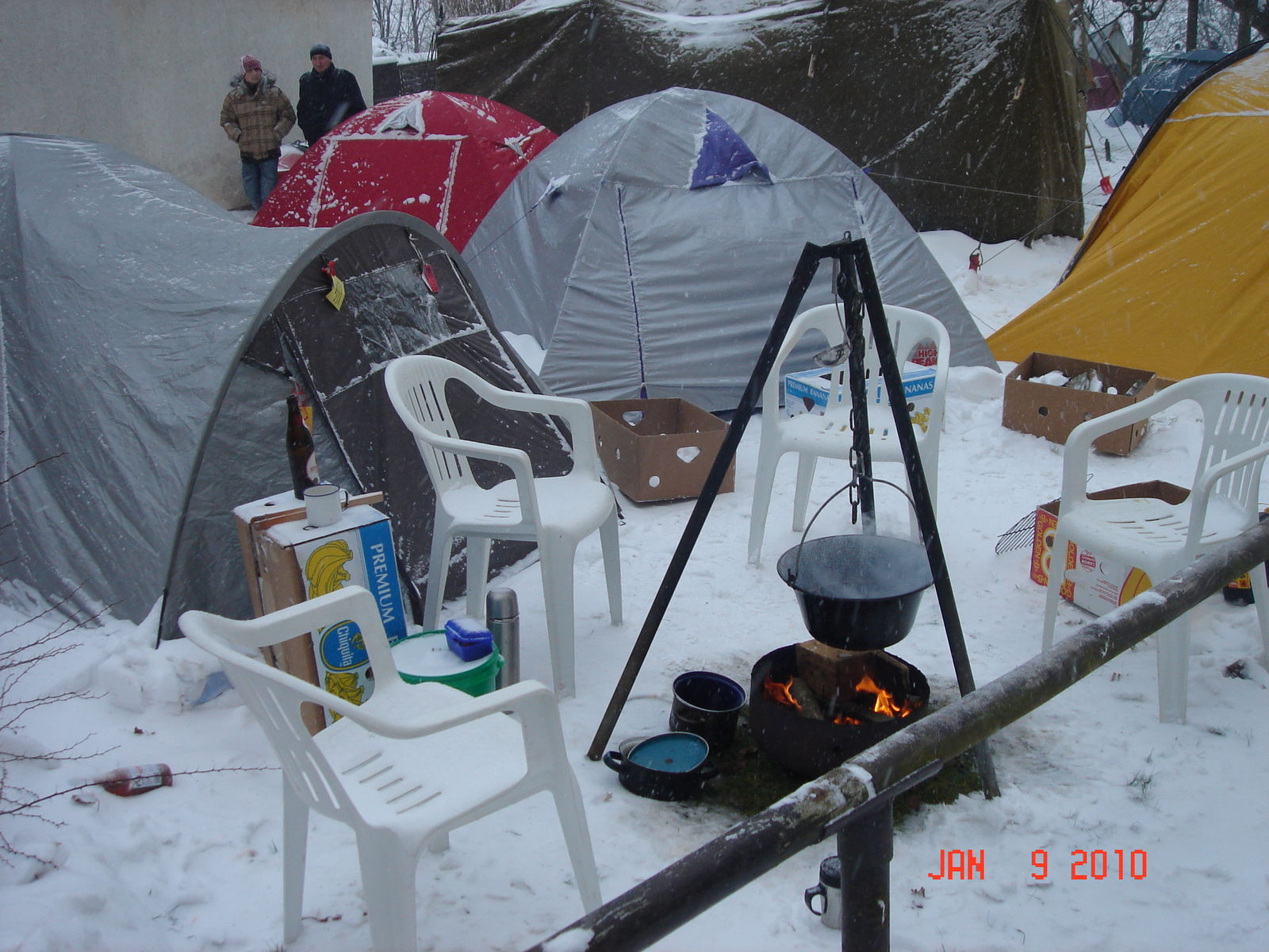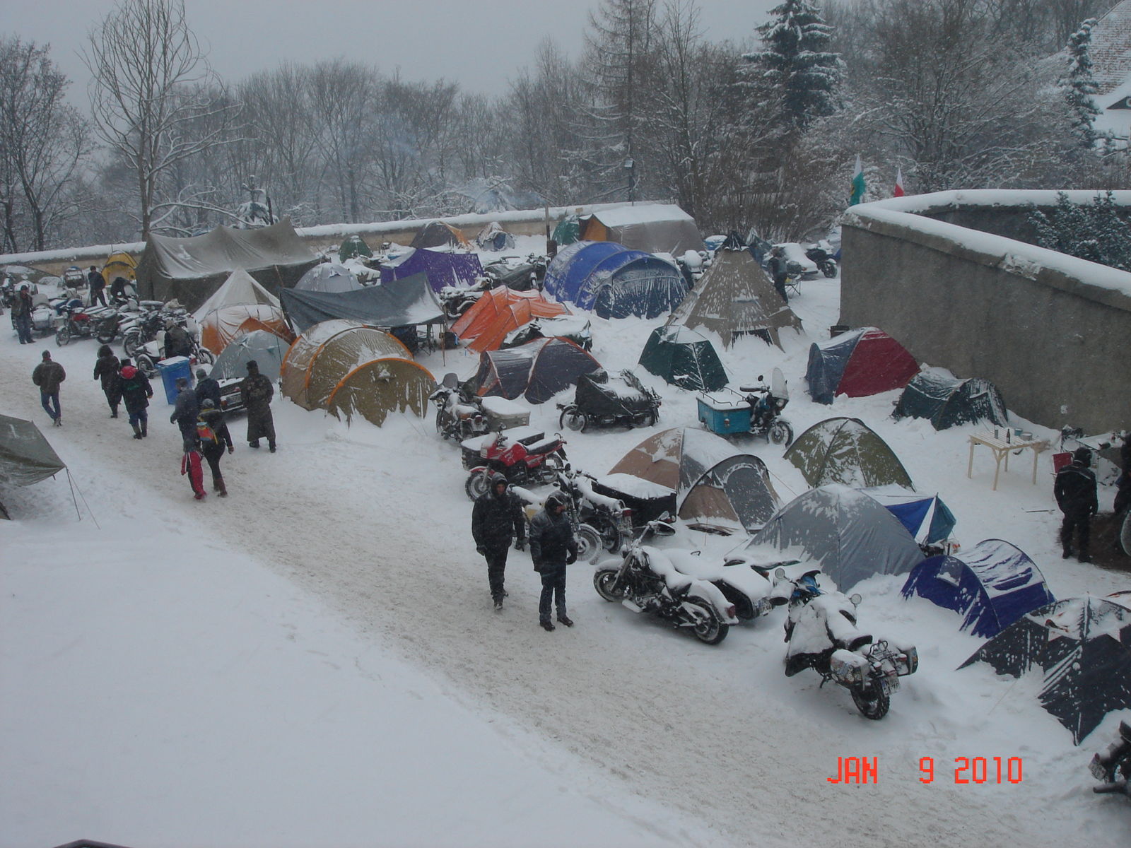 Etwa 200 frostunempfindliche Camper machten Schloss Augustusburg zum ungewöhnlichsten, aber auch fröhlichsten Zeltplatz der Region. Bereits seit Dienstag hatten sich die ersten Biker im Tiefschnee einen Platz mit romantischem Ausblick gesichert. Mit Lagerfeuern, Feuerkörben und sogar kleinen Öfen hielten sich die ganz harten Wintertreffen-Teilnehmer warm. Wahlweise auch mit Bärenfell auf dem Sitz, beheizbaren Handschuhen und einer aufblasbaren Sozia sorgten die Biker für eigenes Wohlbefinden und schmunzelnde Zaungäste. Rund 10.000 Besucher wollten die Zweiräder aller Bauarten, verschiedener Baujahre, ausgestattet mit allen denkbaren Raffinessen, und ihre passionierten Lenker besuchen und sorgten in der kleinen Stadt für reichlich Besucherverkehr. Etwa 200 Helfer, Ordner und Polizeikräfte bemühten sich um eine geregelte Massenbewegung.