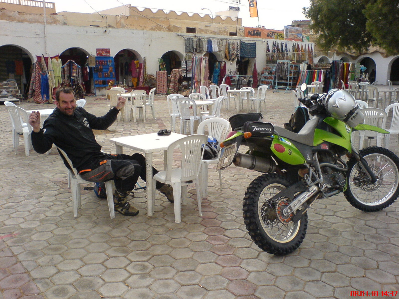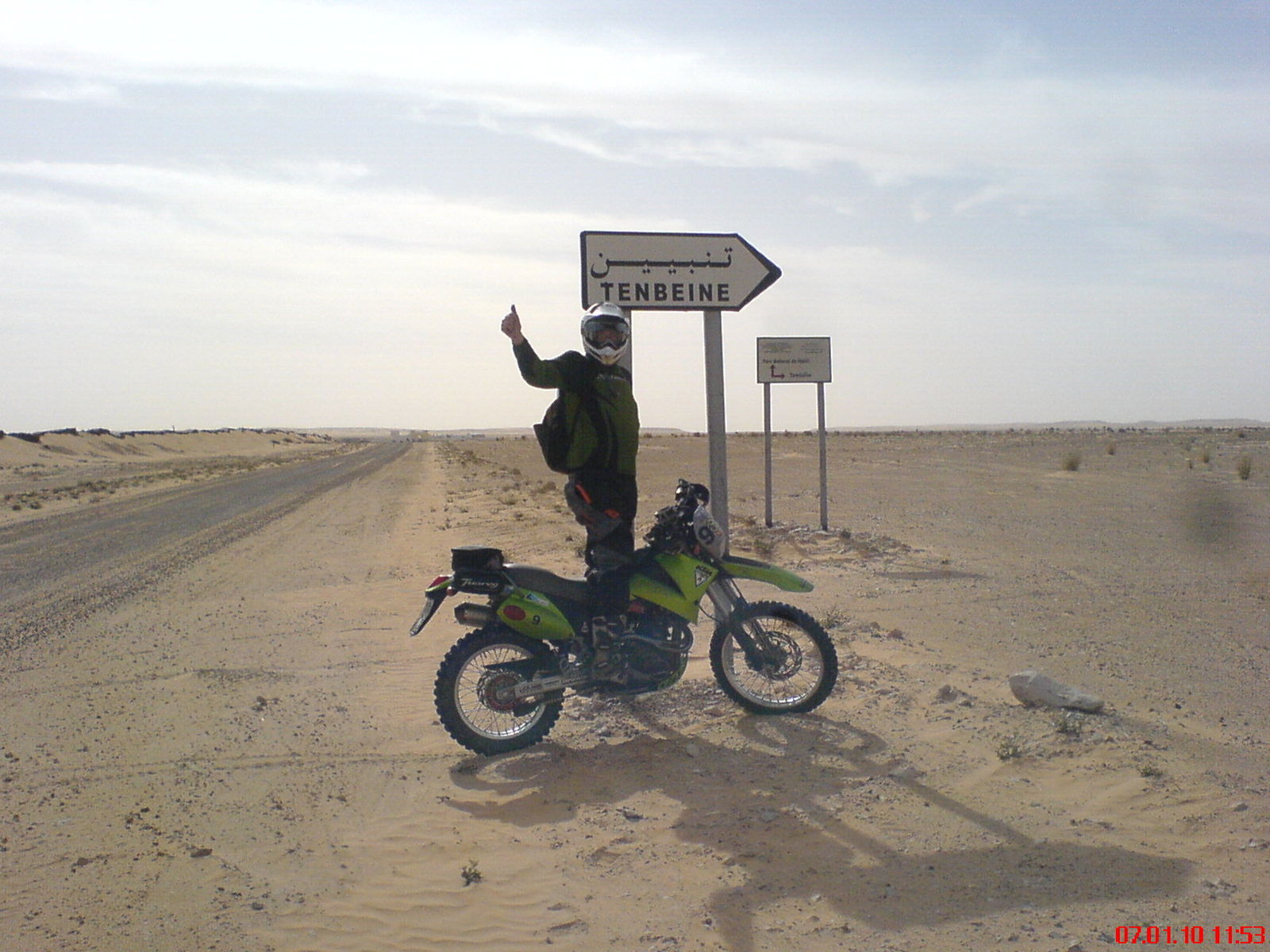 ich bin am 28.12.2009 gemütlich von Dresden nach Frankfurt geflogen, wo ich einen Teil der andern Leute der Wüstentruppe traf, von denen ich bis dahin niemand kannte. Mein Motorrad hatte ich 14 Tage vorher mit dem Anhänger bei -20° zum rund 500 km entfernten privaten Veranstalter gebracht, der Thomas begleitete mich. Da ich nur ein bestimmtes Zeitfenster für meinen Jahresurlaub habe und gern mal mit meinem eigenen Motorrad in die Sahara wollte, war die Auswahl an Veranstaltern dann doch nich so groß. Auf eigene Faust war mir für das erste mal richtig in die Wüste zu riskant und für 4-active gabs gute Referenzen.