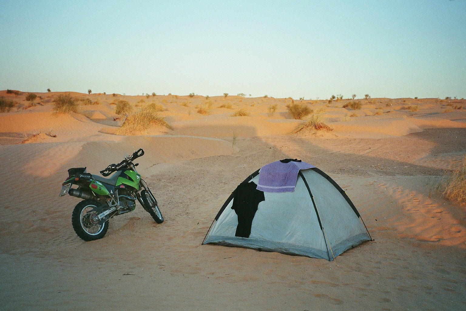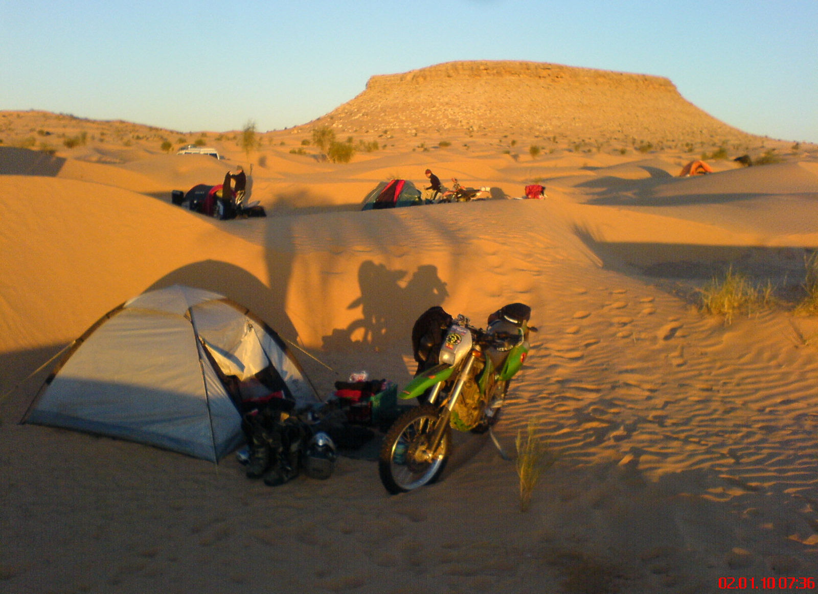 Mein Zelt auf- und abbauen klappt gut, Wir erreichen Ghilane, eine ziemlich große Oase, gegen Mittag und gehen in dem berühmten See baden, ziemlich viel los vor dem Jahreswechsel, und essen was. Der Freddy hat aber nich vor hier zu campieren, er will Silvester am Tembaine sein. So brechen wir etwas hektisch auf, ich schnappe noch schnell Koordinaten und Cafe Bebane auf, ein Wüstencafe, was auch immer das is. Jetzt kommen gleich heftige Dünen, der Sand trägt am Nachmittag gar nich mehr. Von Piste nichts zu sehen. Die zwei besten Motorradfahrer fahren vor, ich bin hinter den LKWs, die fahren einen komplett anderen Rhythmus, hinterherfahren geht gar nicht, ohne die Kupplung zu ruinieren. Einfach überholen und denen im Weg rumfahren geht auch nicht, also versuche ich 2-3 Dünen entfernt, rechts vorbei zukommen. Das geht schief, ich grabe mich an einer ganz ungünstigen Stelle ein, brauche eine Viertelstunde bis ich wieder vorwärts komme, jetzt ist keiner mehr in Sichtweite. Ich versuche die Route zu schneiden und schnell zu dem Motorradfahrern aufzuschliessen. Ich erreiche sie aber nicht, und beschließe, nun wieder auf die LKWs zu warten, die haben aber inzwischen eine andere Route eingeschlagen und sind nochmal zum alten Fort hochgefahren. Ich begreife langsam, dass ich jetzt alleine in der Wüste stehe. Meine Panikattake unterdrücke ich mit dem rationalen Gedanken, dass ich ja grad getankt und die Wasserblase aufgefüllt habe. Ich rauche hektisch und überlege: zurück nach Ghilane, wo die Anderen ja definitiv nicht sind oder allein weiter zu diesem Cafe. Arabische Jeeps kommen vorbei und erkundigen sich, ob alles in Ordnung ist, ich weiß nicht so richtig was ich sagen soll. Ich fahre zu dem Wegpunkt, den ich habe, per Luftlinie, die Strecke geht jetzt halbwegs, teilweise ist Piste erkennbar und jetzt kommts dick, der Punkt ist mitten in der Pampa, nix Cafe, nix die Anderen. Kein Netz. Ich warte an dem Punkt, mir wirds jetzt anders, nicht mehr lange bis zum Sonnenuntergang. Es halten mal wieder welche, ich frage,wo hier das nächste Cafe ist, 25 km Richtung Douz ist die Antwort, hm prima. Ich forste mein Oregon durch und entdecke ein Bierkrugsymbol auf der Tunesienkarte, nicht weit. Jetzt kommt eine Gruppe schweizer Enduristen in der richtigen Richtung, ich entschließe mich, bei denen mitzufahren, schaffe es aber nicht, weil die Karre wieder etwas muckert (übrigens das letzte mal, ab da lief sie ohne einen Aussetzer) Jedenfalls komme ich zu einer Strohhütte mit Bettenlager, die Schweizer fahren weiter. Ich entdecke ein Schild Cafe Grand Erg. Hm ich denke, gerettet, aber falsch hier. Der Besitzer, ein netter Araber, bemerkt meine Sorge und gibt mir erstmal einen Tee. Nach einigem Gespräch bekomme ich heraus, dass dies das Cafe Bebane ist, auf arabisch. Der muß denken, dass ich nich ganz dicht bin, weil ich mir das noch mind. 15 x bestätigen lasse. Es dauert etwas, da kommen unsere 2 Motorradfahrer und später der ganze Troß. Ein Stein fällt vom Herzen. Ich erfahre später, dass die Koordinaten aus dem GoogleEarth stammten und somit eine Abweichung in sich trugen, anderes System. Der Schock sass. Nachtlagerunweit vom Cafe.