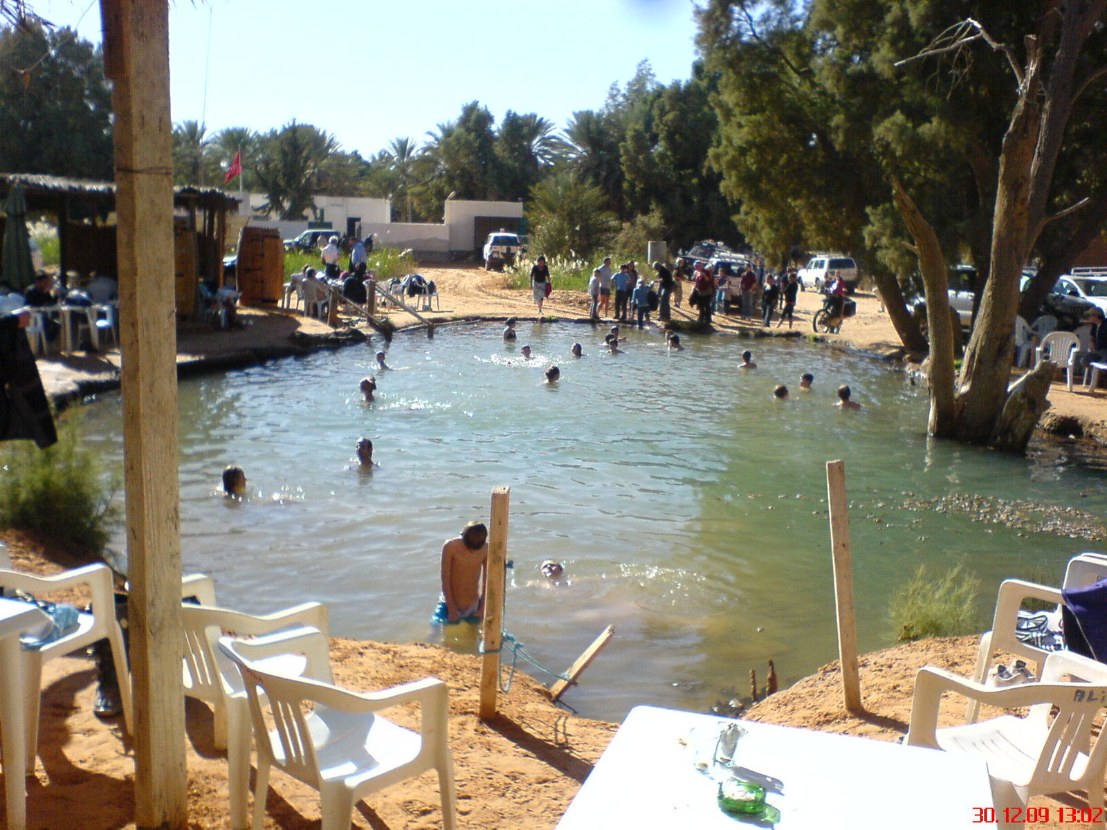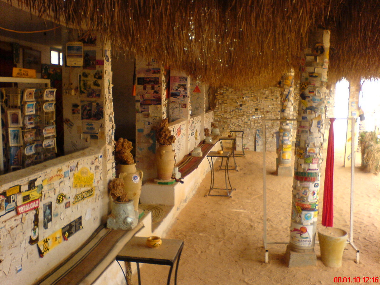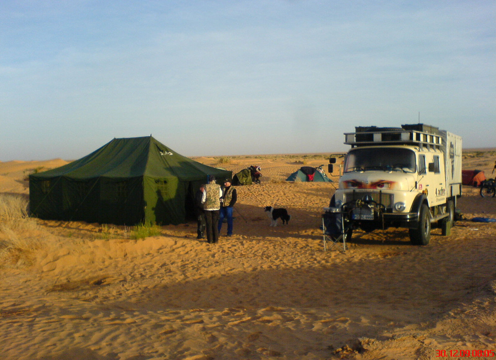 Mein Zelt auf- und abbauen klappt gut, Wir erreichen Ghilane, eine ziemlich große Oase, gegen Mittag und gehen in dem berühmten See baden, ziemlich viel los vor dem Jahreswechsel, und essen was. Der Freddy hat aber nich vor hier zu campieren, er will Silvester am Tembaine sein. So brechen wir etwas hektisch auf, ich schnappe noch schnell Koordinaten und Cafe Bebane auf, ein Wüstencafe, was auch immer das is. Jetzt kommen gleich heftige Dünen, der Sand trägt am Nachmittag gar nich mehr. Von Piste nichts zu sehen. Die zwei besten Motorradfahrer fahren vor, ich bin hinter den LKWs, die fahren einen komplett anderen Rhythmus, hinterherfahren geht gar nicht, ohne die Kupplung zu ruinieren. Einfach überholen und denen im Weg rumfahren geht auch nicht, also versuche ich 2-3 Dünen entfernt, rechts vorbei zukommen. Das geht schief, ich grabe mich an einer ganz ungünstigen Stelle ein, brauche eine Viertelstunde bis ich wieder vorwärts komme, jetzt ist keiner mehr in Sichtweite. Ich versuche die Route zu schneiden und schnell zu dem Motorradfahrern aufzuschliessen. Ich erreiche sie aber nicht, und beschließe, nun wieder auf die LKWs zu warten, die haben aber inzwischen eine andere Route eingeschlagen und sind nochmal zum alten Fort hochgefahren. Ich begreife langsam, dass ich jetzt alleine in der Wüste stehe. Meine Panikattake unterdrücke ich mit dem rationalen Gedanken, dass ich ja grad getankt und die Wasserblase aufgefüllt habe. Ich rauche hektisch und überlege: zurück nach Ghilane, wo die Anderen ja definitiv nicht sind oder allein weiter zu diesem Cafe. Arabische Jeeps kommen vorbei und erkundigen sich, ob alles in Ordnung ist, ich weiß nicht so richtig was ich sagen soll. Ich fahre zu dem Wegpunkt, den ich habe, per Luftlinie, die Strecke geht jetzt halbwegs, teilweise ist Piste erkennbar und jetzt kommts dick, der Punkt ist mitten in der Pampa, nix Cafe, nix die Anderen. Kein Netz. Ich warte an dem Punkt, mir wirds jetzt anders, nicht mehr lange bis zum Sonnenuntergang. Es halten mal wieder welche, ich frage,wo hier das nächste Cafe ist, 25 km Richtung Douz ist die Antwort, hm prima. Ich forste mein Oregon durch und entdecke ein Bierkrugsymbol auf der Tunesienkarte, nicht weit. Jetzt kommt eine Gruppe schweizer Enduristen in der richtigen Richtung, ich entschließe mich, bei denen mitzufahren, schaffe es aber nicht, weil die Karre wieder etwas muckert (übrigens das letzte mal, ab da lief sie ohne einen Aussetzer) Jedenfalls komme ich zu einer Strohhütte mit Bettenlager, die Schweizer fahren weiter. Ich entdecke ein Schild Cafe Grand Erg. Hm ich denke, gerettet, aber falsch hier. Der Besitzer, ein netter Araber, bemerkt meine Sorge und gibt mir erstmal einen Tee. Nach einigem Gespräch bekomme ich heraus, dass dies das Cafe Bebane ist, auf arabisch. Der muß denken, dass ich nich ganz dicht bin, weil ich mir das noch mind. 15 x bestätigen lasse. Es dauert etwas, da kommen unsere 2 Motorradfahrer und später der ganze Troß. Ein Stein fällt vom Herzen. Ich erfahre später, dass die Koordinaten aus dem GoogleEarth stammten und somit eine Abweichung in sich trugen, anderes System. Der Schock sass. Nachtlagerunweit vom Cafe.