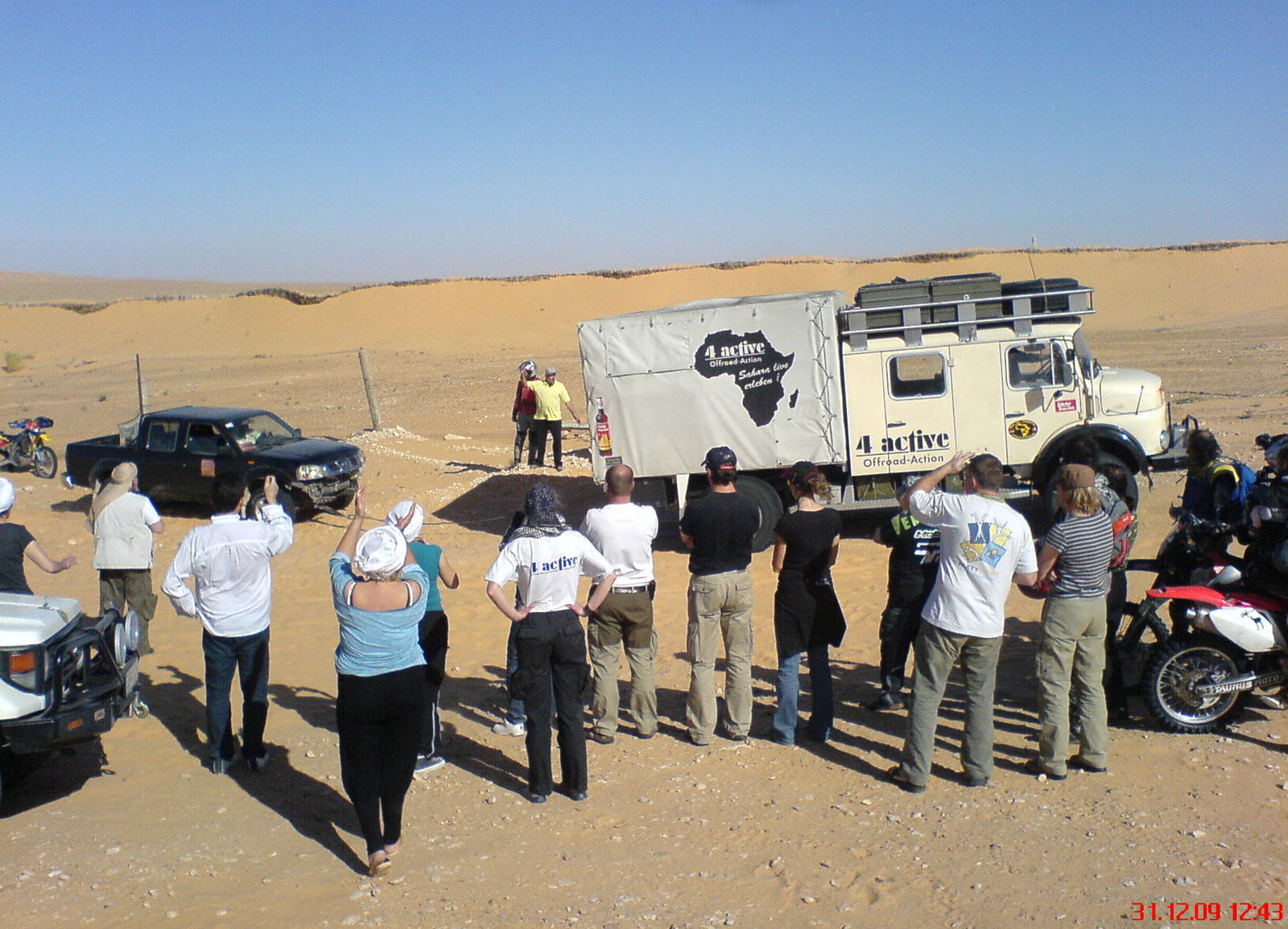 es läuft nun beschwerlich, später brauchen auch wir Hilfe, Italiener ziehen mit ihrem 'Dakar'-Lkw unseren MAN souverän frei. Wir erreichen die berühmten drei Tafelberge am späten Nachmittag und wollen hier 2 Tage, eigentlich in Abgeschiedenheit, campieren. Wir sehen dutzende Offroadergruppen zum Camp Mars fahren. Silvesterschmaus, Sekt, Lagerfeuer, wir sind reichlich 20 Leute und haben Zeit uns näher kennen zu lernen.