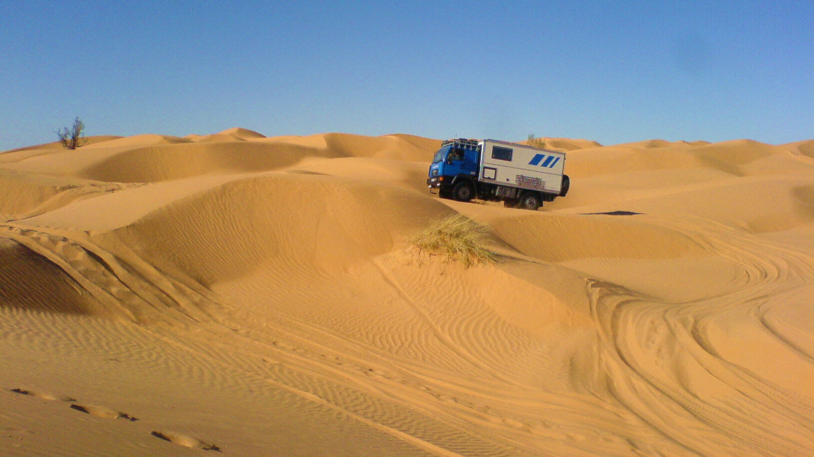 Tag 2: Es ist unglaublich, wenn man sich diese Dünenformationen anschaut, kommt ständig die Rückmeldung aus dem Gehirn: „das geht nicht, das geht jetzt wirklich nicht mehr“ - kurz darauf kommt der Freddy mal fluchend, mal grinsend mit dem Rundhauber mit tonnenschwerer Ladung spektakulär drübergeschaukelt. Dünenkämme werden zurechtgeschaufelt, Sandbleche gelegt, Neigungswinkel und Verschränkung voll ausgeschöpft. Mitreisende Ehefrauen können teilweise nicht dabei zusehen, was mit den Fahrern und Fahrzeugen passiert. Beim Rundhauber reist die Führerkabine aus den Ankern, es geht trotzdem weiter.