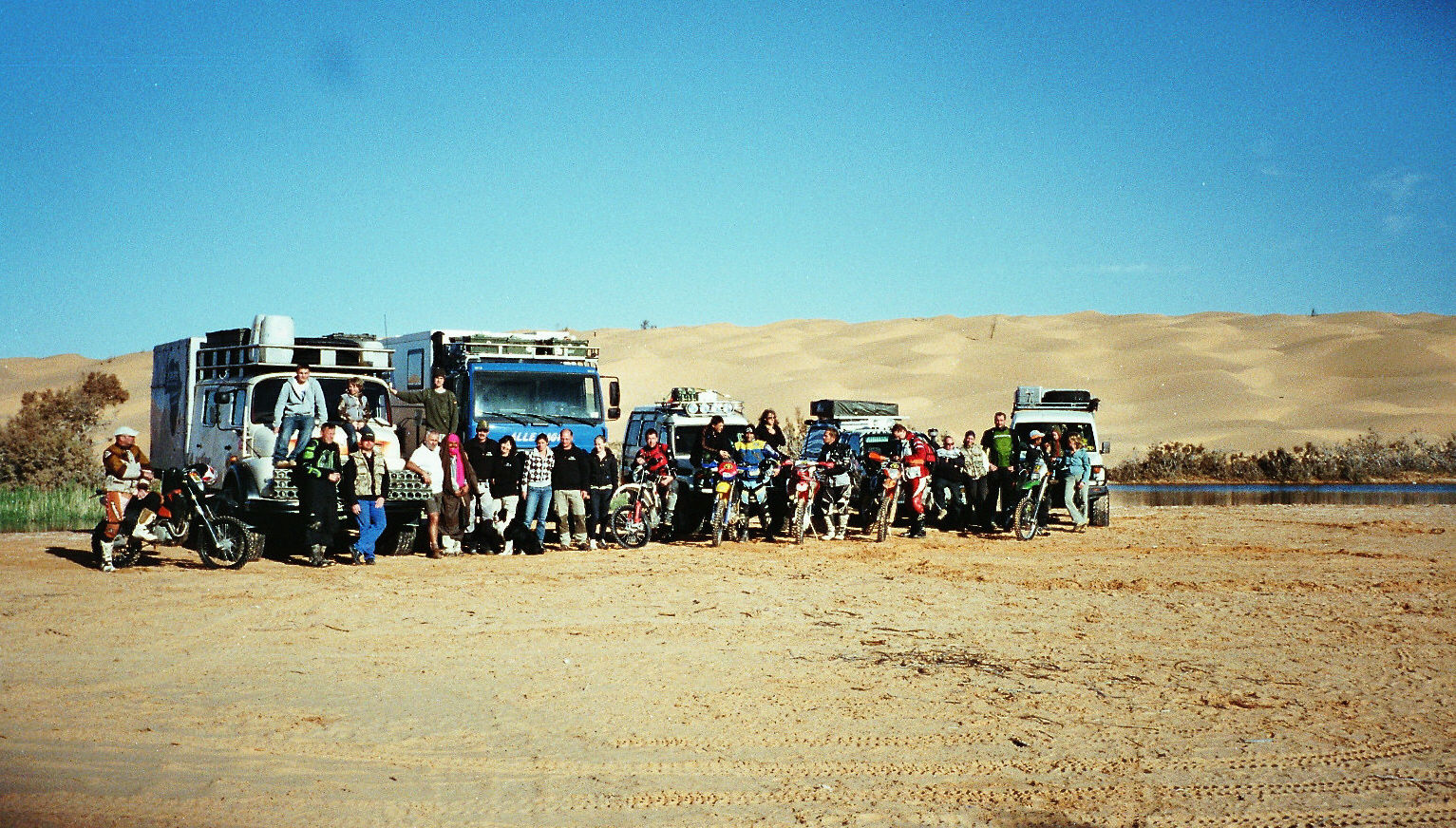 Ich gehe je nach Gefühl mal eher schlafen mal sizte ich bis nach Mitternacht am Lagerfeuer. Ich schlafe meist gut und plage mich nur etwas mit dem zuvielen Gepäck rum, man brauch hier wirklich nich viel. Früh gehts meistens so um 9 raus und gegen 11 ist dann Abfahrt. Tagsüber gibts immer eine große Picknickpause und die Bikes werden aus den Kanistern betankt. Alles ist da, man muß sich aber um sich selbst kümmern, man bekommt nichts hinterhergetragen, z.B. Luftdruck, Öl, Wasser, Isotrink, Riegel, die man hier auch wirklich braucht. In der Regel läuft alles ziemlich schnell, aber gut organisiert ab und mit der Zeit kommt man rein und es geht alles schneller, so dass sich auch individuelle Freiräume ergeben, z. B. mal ne Stunde einfach nur so in die Dünen liegen oder Tagebuch schreiben, es ist ja alles so interessent und anders als man es von zu hause gewohnt ist und zelten war ich auch schon lange nich mehr. Den anderen Fahrzeugen mitzuhelfen oder auch mal zuzuschauen, wie man mit der Winde arbeitet und einen vergrabenen Landcruiser befreit.