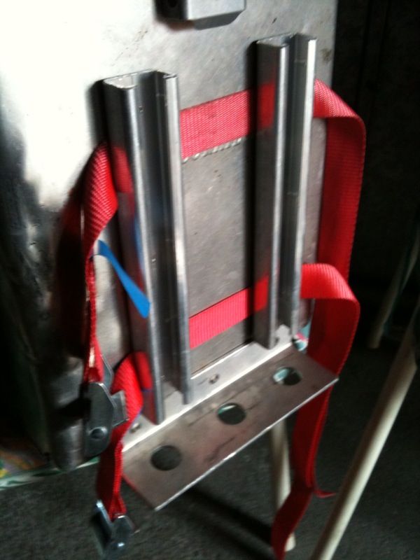 In der Bastelbude habe ich dann schnell einen Winkel zurecht gesägt und ein paar C-Profile, ein paar Spanngurte geopfert und das ganze vernietet. Fertig ist die Prototyp Halterung! Nur noch die Kanister getrennt, fertig. Jetzt habe ich wahlweise 2 mal 3 Liter, 2 mal 5 Liter oder 1 mal 3 und 5 Liter die ich mitführen kann.